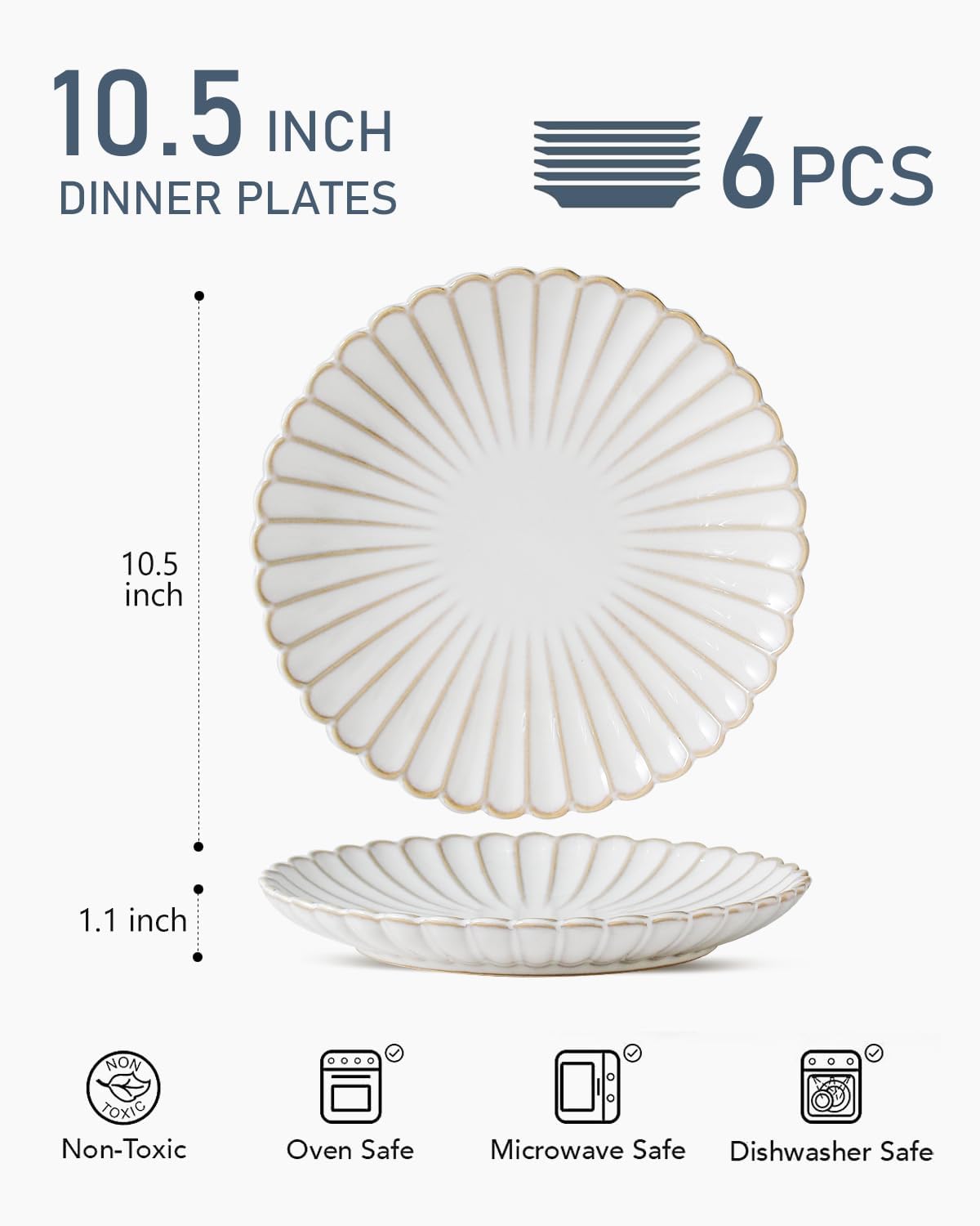 Create a timeless table setting with this Set of 6 Dinner Plates. Each plate is crafted from durable ceramic and finished in a soft, antique-inspired ivory glaze, complemented by an elegant embossed scroll design that wraps around the rim. These plates blend sophistication with function, making them ideal for both everyday dining and elevated occasions.