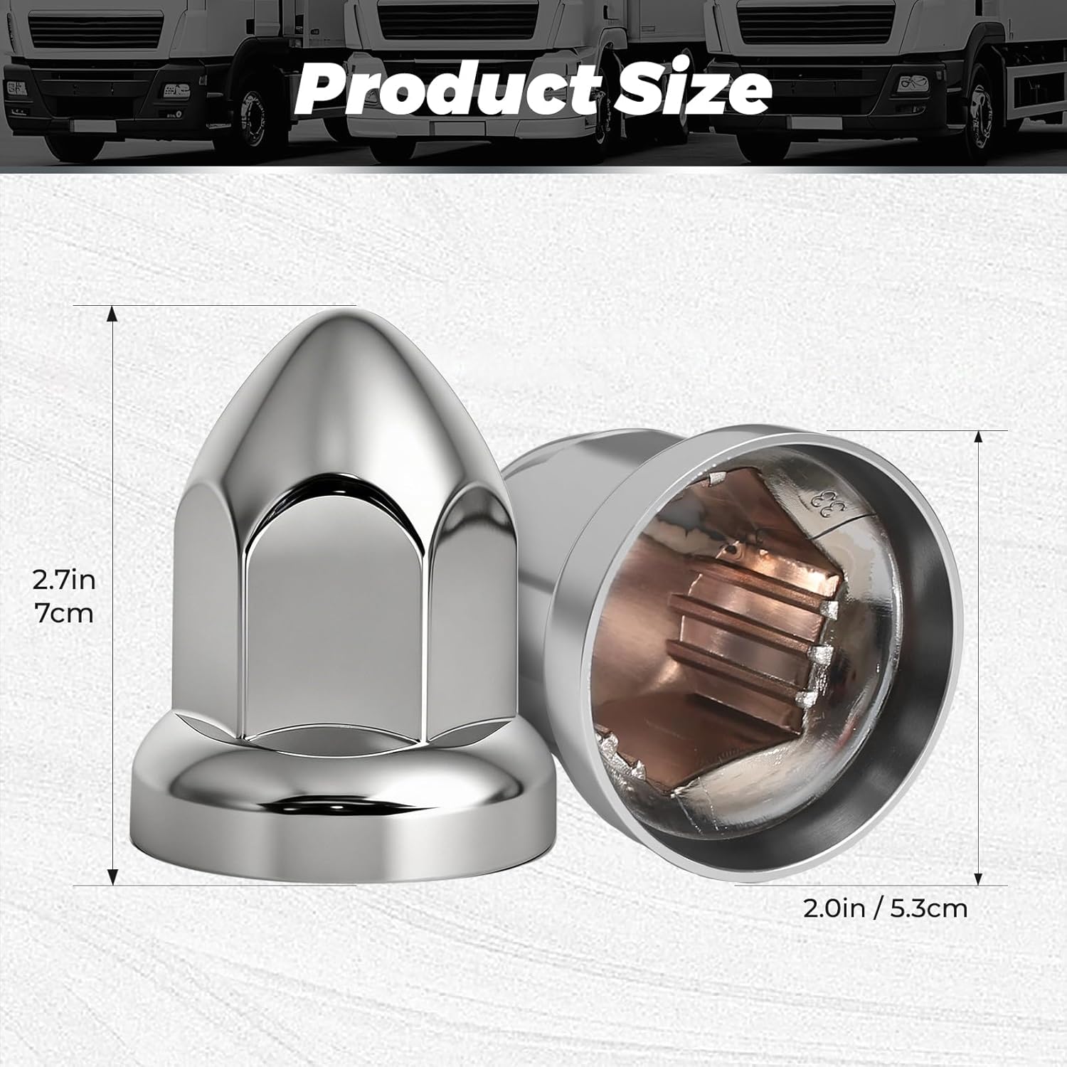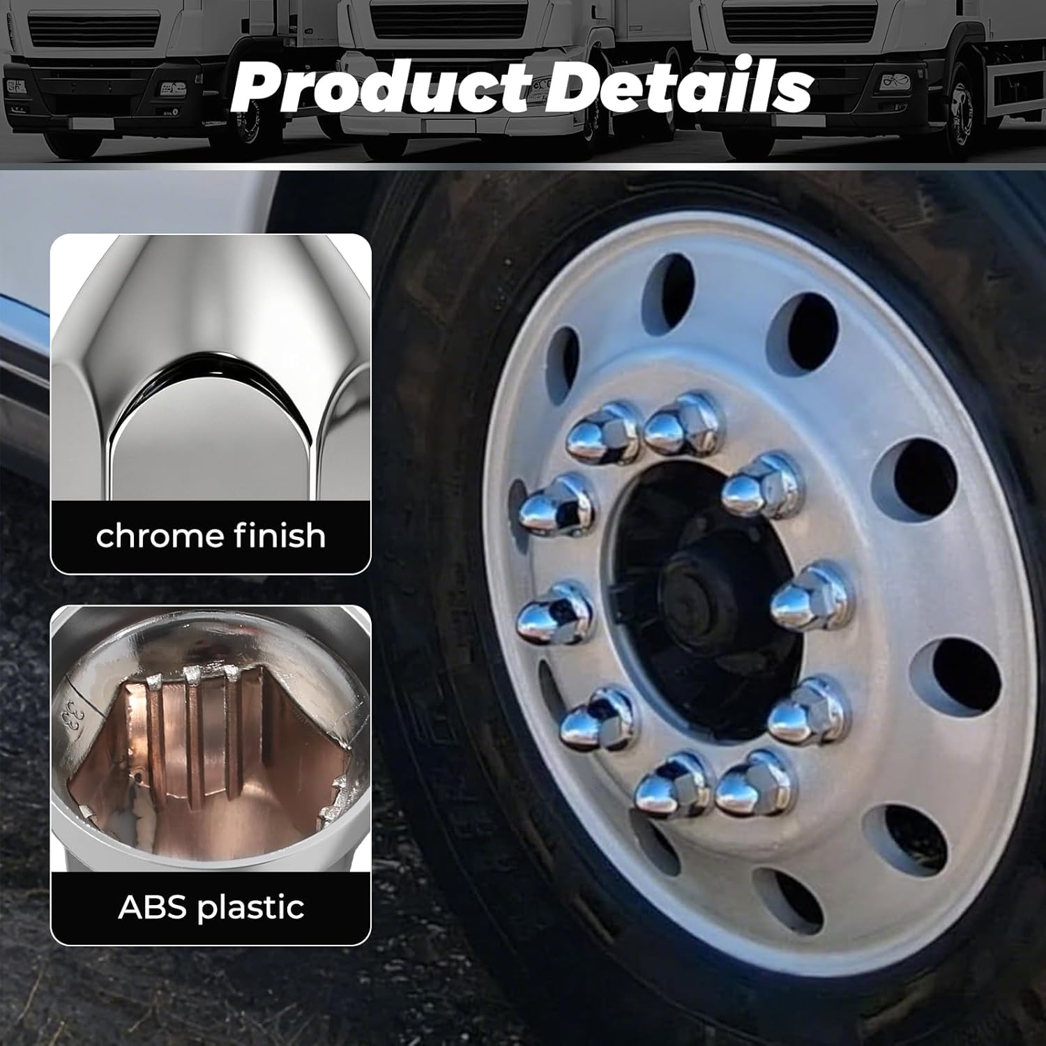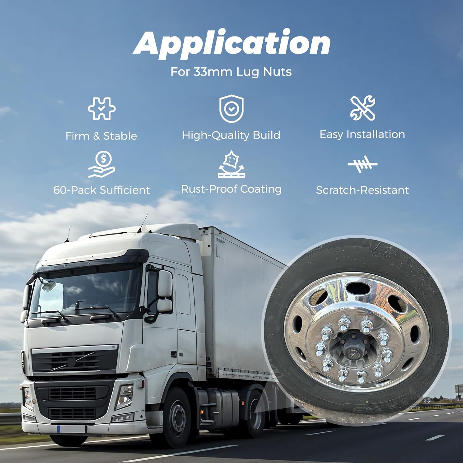 The 33mm semi truck lug nut covers set is designed for drivers seeking dependable protection and a cleaner wheel appearance during daily hauling, long-distance freight, and routine yard operations. Built for trucks, trailers, and vehicles using standard 33mm flange nuts, the push-on design with an integrated flange keeps each cap securely in place even on rough routes. This kit includes 60 lug nut covers and a removal tool, offering full coverage for six wheels and simplifying maintenance without the need for extra equipment.Each lug nut cover measures 33mm in diameter and 2.5 inches in height, engineered for compatibility with most semi trucks and trailers using 33mm nuts. The set replaces general 33mm decorative caps and works with popular truck models that use standard 33mm lug nuts, supporting fleet vehicles, highway trucks, and utility trailers. The included removal tool helps streamline replacement during service stops.The product offers several functional advantages, including a snug push-on fit that helps reduce vibrations and prevents caps from loosening during high-speed driving. The durable ABS structure supports long-term use and helps maintain a uniform, polished wheel appearance. The 60-piece quantity ensures sufficient coverage for complete wheel sets.Users will find the installation process simple and efficient, with each cap pressing firmly onto the lug nut for a secure hold. Routine checks and replacements can be completed quickly using the included tool, reducing downtime during maintenance. This package aims to provide reliable fitment, dependable durability, and an improved visual experience for truck and trailer owners. Customers can expect practical performance designed for daily operation and long-term value.
