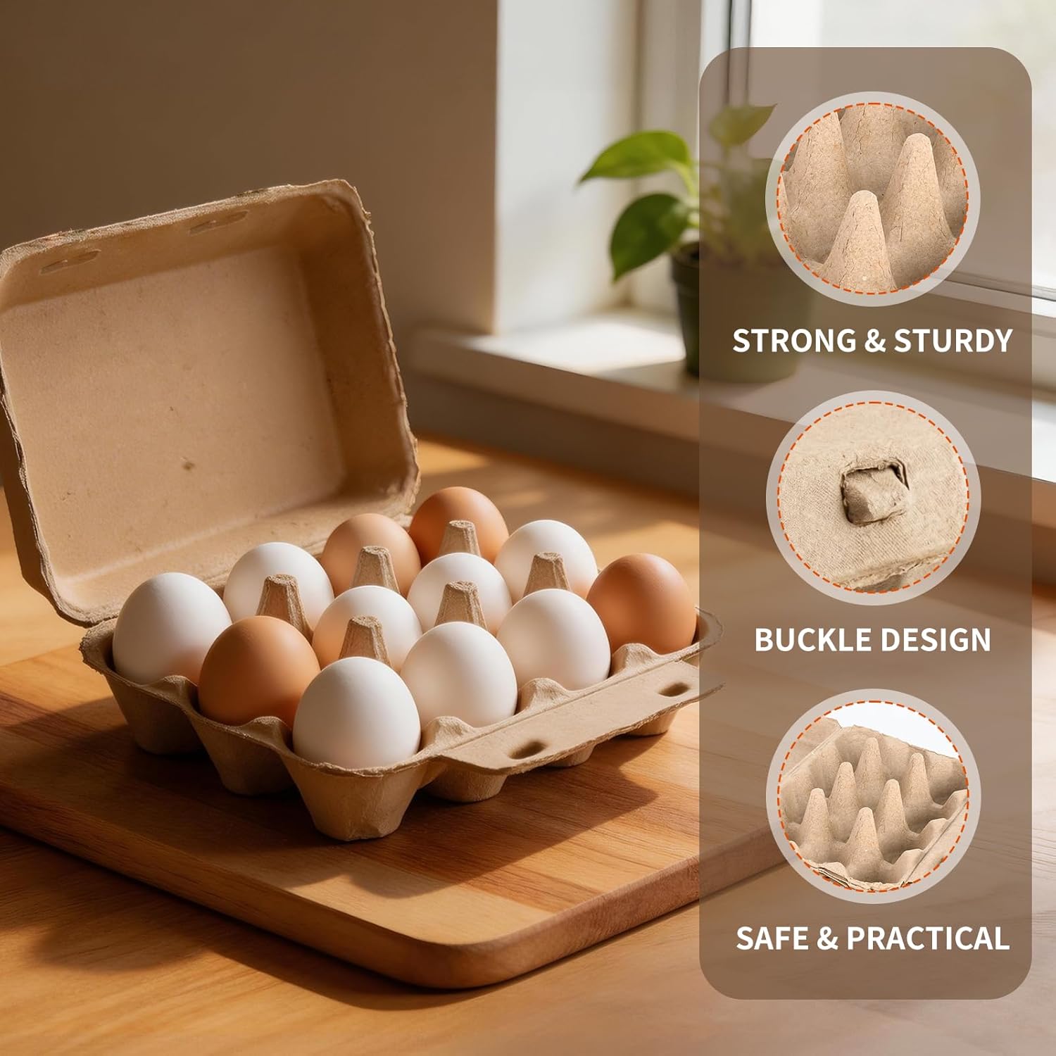 Features: 3x4 egg pulp trays, 12-compartment, holds chicken/duck eggs, recycled pulp, sturdy, reusable, printed with cute hen patterns, stackable Easy to use: No assembly needed, directly place eggs in compartments. Stackable for storage, lightweight for transporting eggs safely Specifications: Color: wood Size: 19.5*15*7cm /7.68*5.91*2.76 inch Package includes: 60 pieces of 3x4 egg pulp trays Notes: Manual measurement, please allow a slight error in size. There may be slight color differences due to different screen displays.