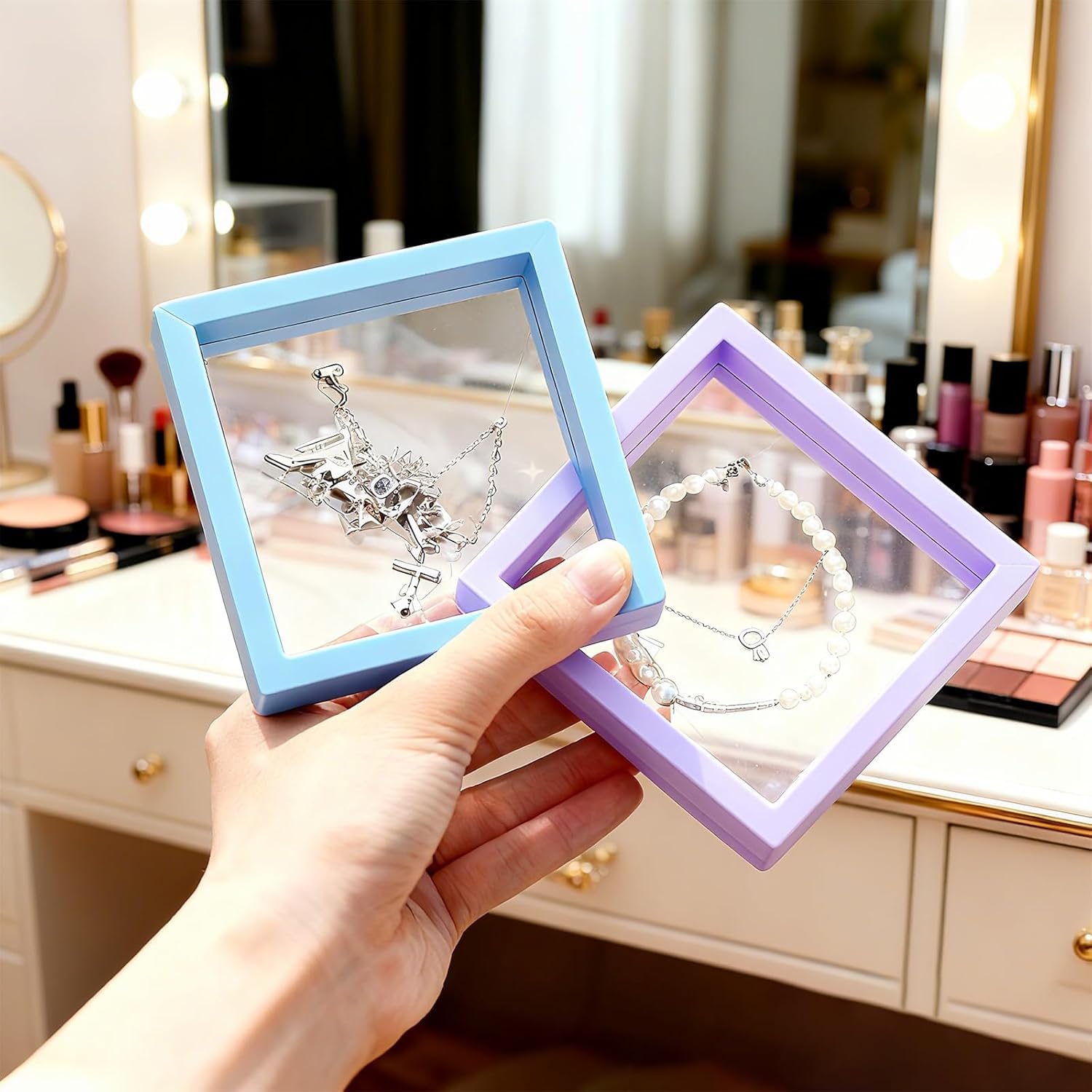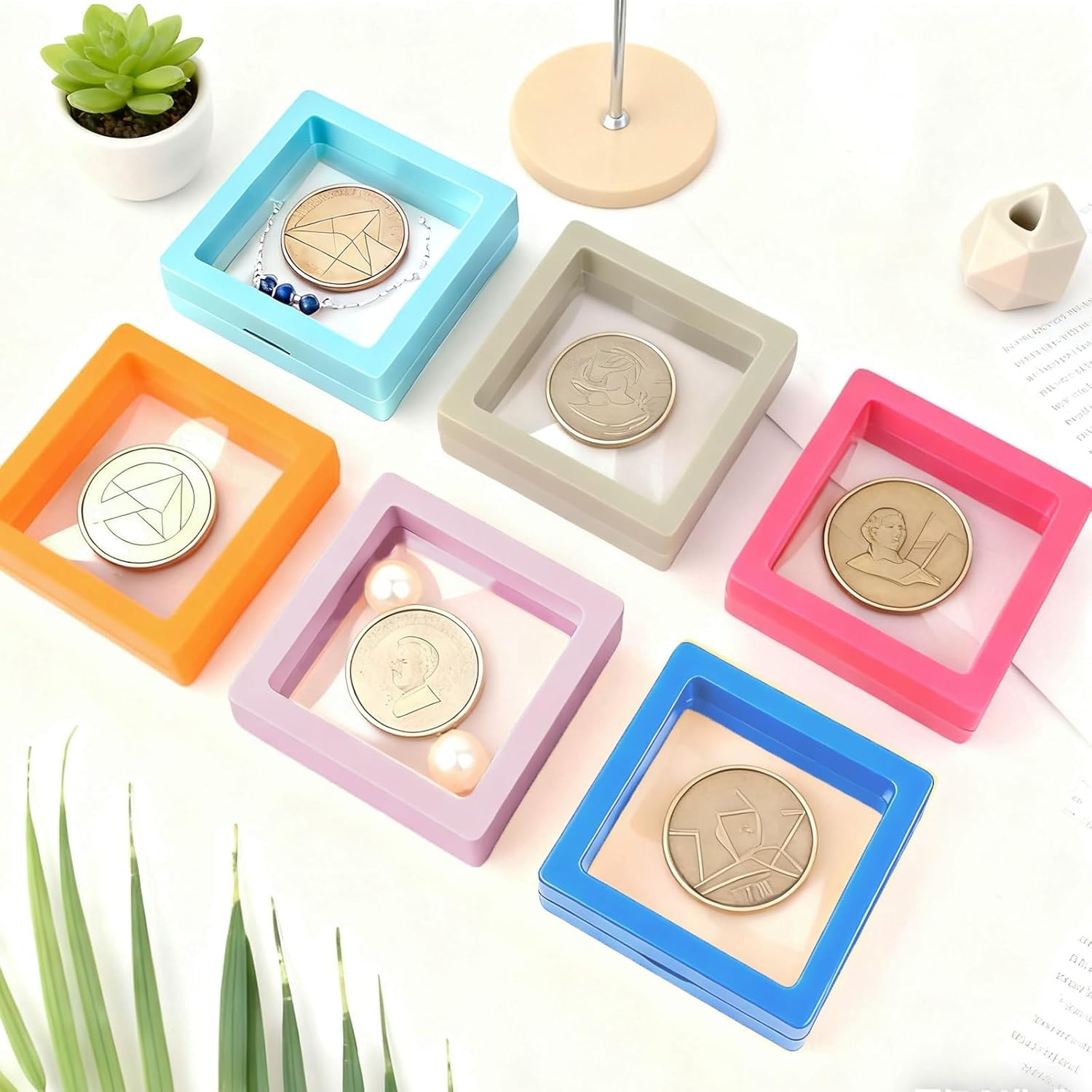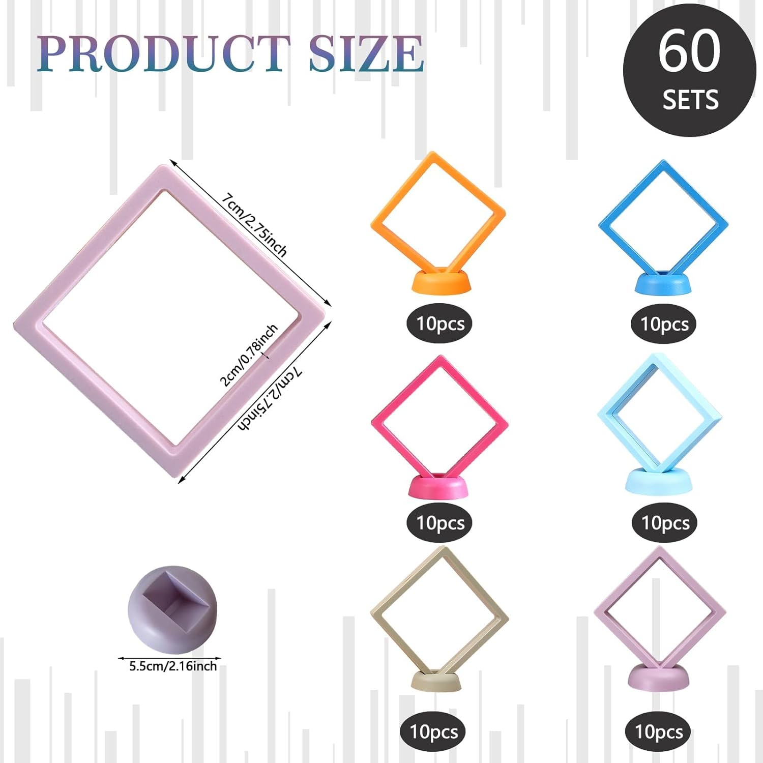 Transform your jewelry display with this versatile set of 60 floating display stands. Each stand measures 2.8 x 2.8 x 0.8 inches, providing the perfect platform to showcase your precious ornaments in a modern, three-dimensional style. The innovative design creates an illusion of floating items, making your jewelry pieces appear more elegant and eye-catching. These stands come equipped with PE film protection to help preserve your valuables from oxidation, ensuring they maintain their luster longer. Available in a delightful array of pastel colors including soft pink, mint green, yellow, and orange, these organizers add a touch of sophistication to any retail display, craft fair booth, or personal vanity. Their compact size makes them ideal for travel, allowing you to safely transport and display your jewelry pieces wherever you go. Perfect for rings, pendants, earrings, and small collectibles, these versatile stands work beautifully as both storage solutions and gift presentation boxes.