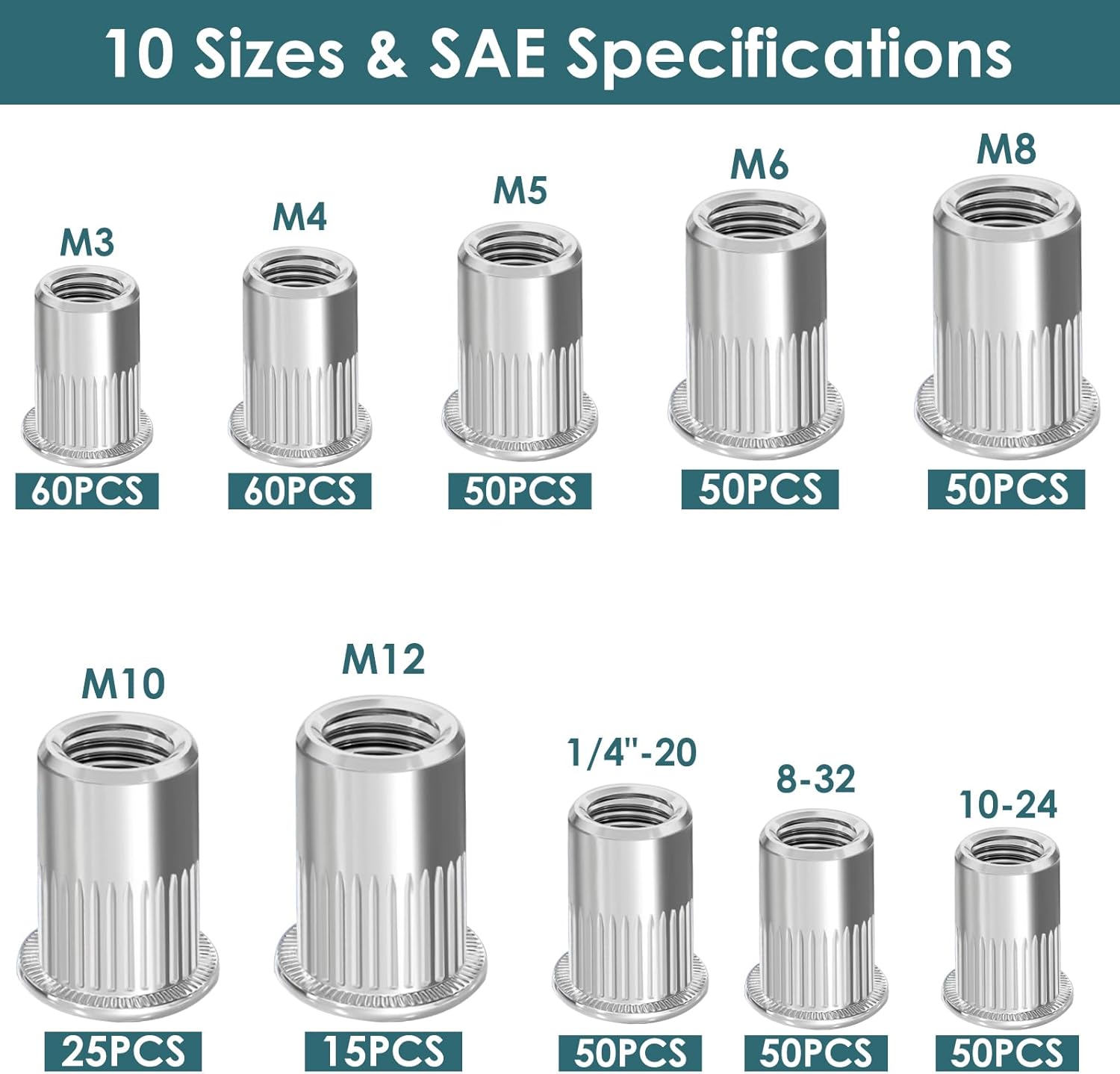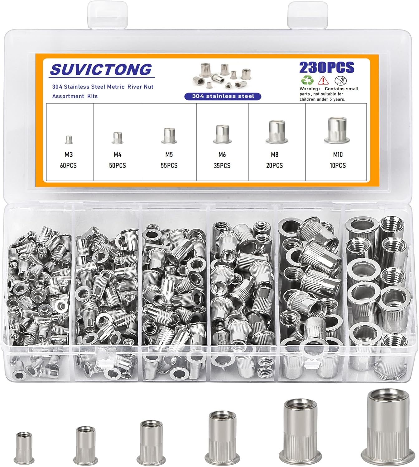 What’s a rivnut? Typically a rivnut is a threaded insert that can be compared somewhat to a rivet in function. They are made to fit tightly into a drilled or punched hole through thin metal, and when using the proper tool a portion of the corrugated area on the outside barrel of the rivnut expands and collapses to lock itself into the hole becoming a captured nut for a bolt to be screwed into.SUVICTONG Premium 304 Stainless Steel Rivet Nuts, Gives You a 5 Stars Reliable Smart Fasteners Home Improvement.Specification: Product Name: Rivet Nut Material: 304 Stainless Steel Grip Range: 0.5mm-1.5mm Thread Size: M3 x 0.5mm Drill Hole Size (+/-0.1): 5mm / 0.2" Total Size: 9x7mm / 0.35"x0.28" (L*Max.D)Package Includes: M3 ------ 60 piecesNote: More choices with different sizes and qualities rivnuts can be applied on SUVICTONG store.