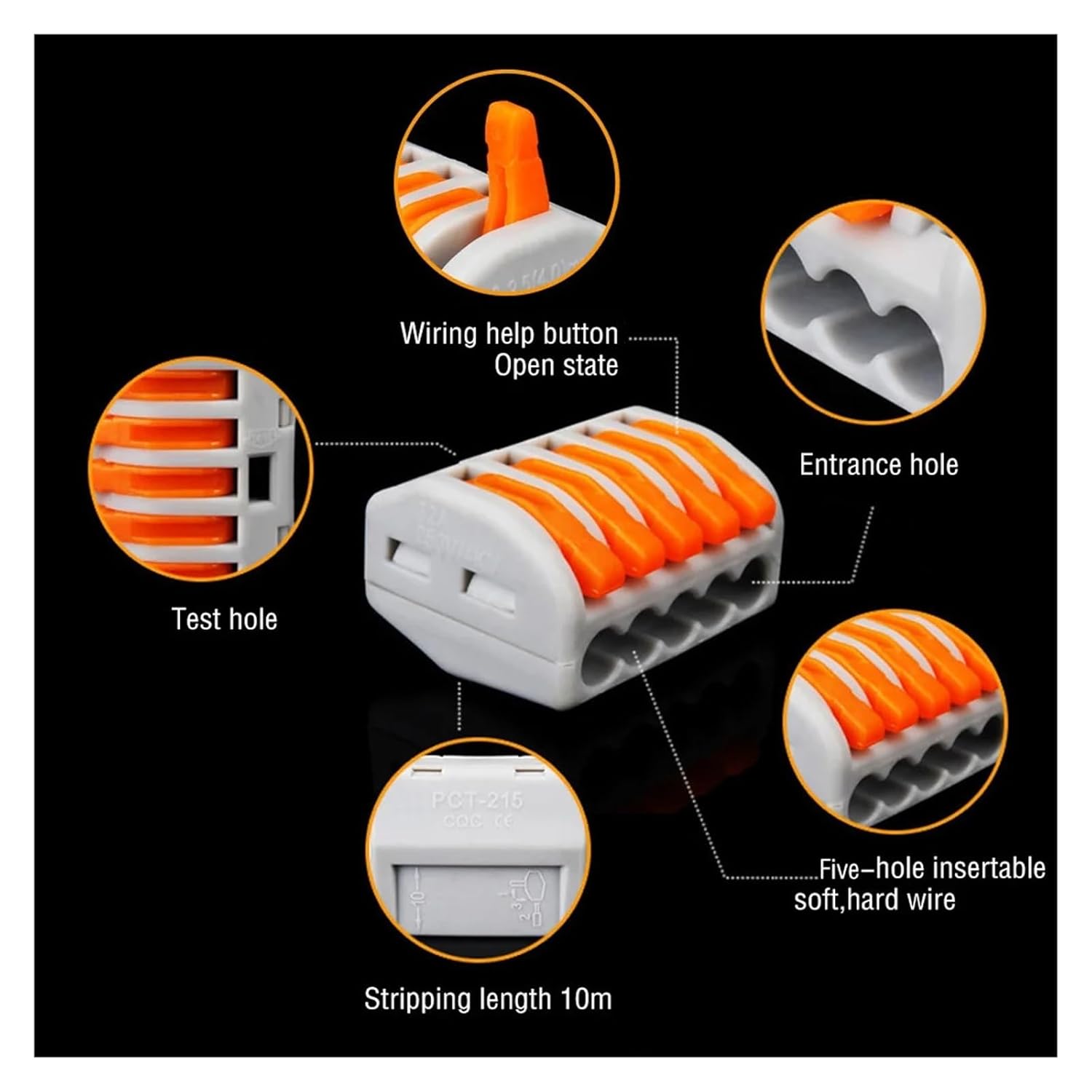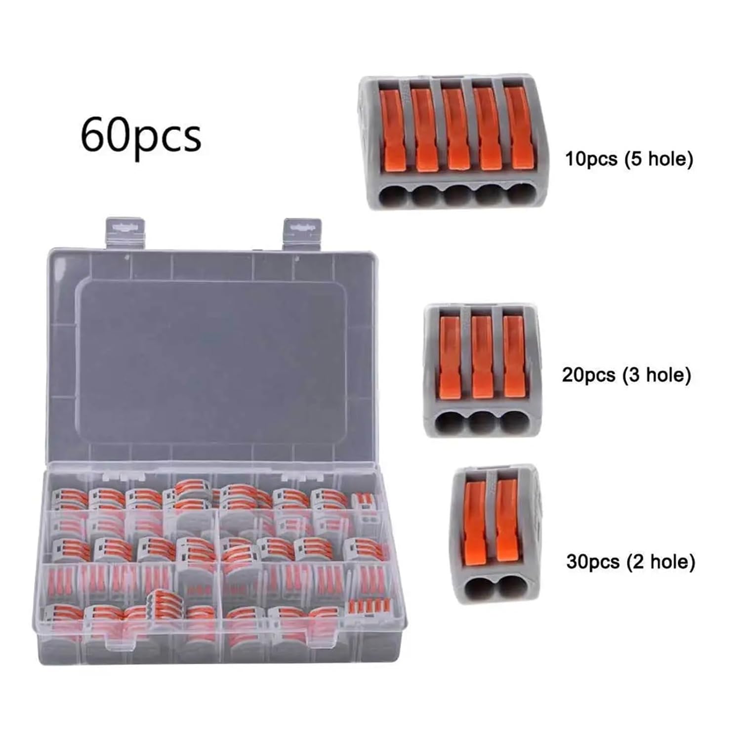 Specification:Shell material: PA6.6Lead current strip material: electrolytic copper (chrome-plated)Spring material: Ni-Cd alloy steelColor: orange + grayRated current: 32ARated voltage: 400VRated impulse voltage: 4KVNumber of connection points (connection type): 2, 3, 5Actuation type: operating leverContinuous service temperature: 85 (Max.)Lead wire stripping wire length: 10mmcompatible lead wire range: 0.08-2.5mm(hard lead wire)0.08-4mm(soft lead wire)Quantity:60pcs(30pcs-2 hole+20pcs-3 hole+10pcs-5hole)2 hole: 1 in 1 out3 hole: 1 in 2 out5 hole: 1 in 4 out(Note: Please allow slight color difference caused by / / screen.)
