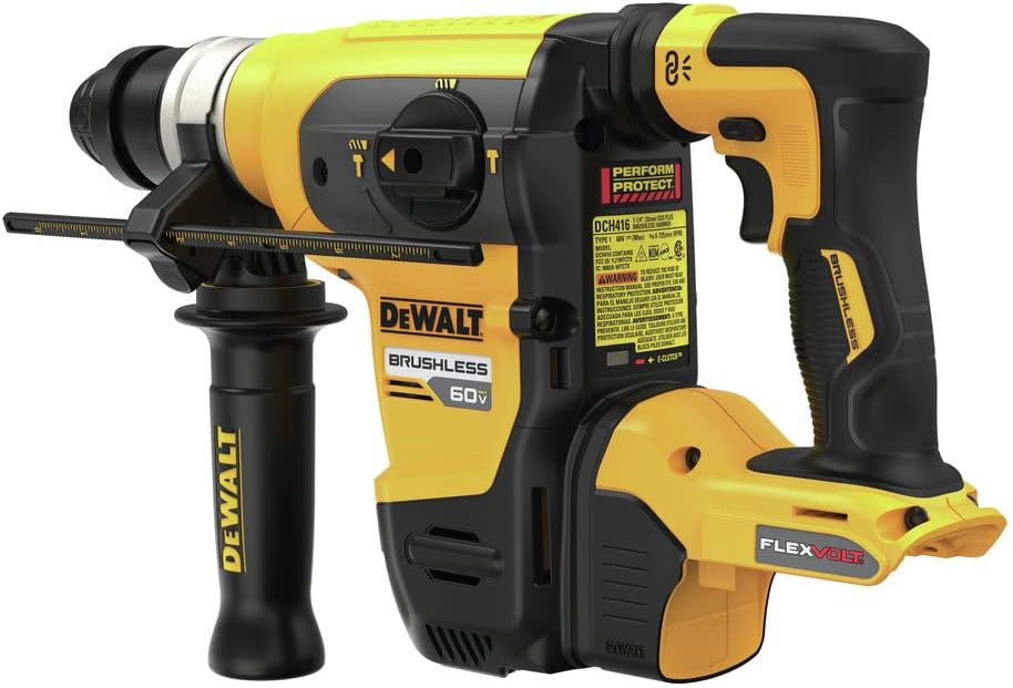 The 60V MAX* 1-3/4 in. Brushless SDS PLUS Rotary Hammer is a midweight, high-performance drill powered by a DEWALT brushless motor and a durable German engineered mechanism. It delivers 4.5 Joules of impact energy for fast drilling and chipping, even in the hardest concrete. The midweight design makes this tool ideal for structural connections, beam and column anchorage, rod hanging, seismic and safety attachments, cable tray and strut mounting, and steel stanchion mounting. This hammer is part of the PERFORM & PROTECT™ product line, integrated with the Anti-Rotation E-CLUTCH® System and the SHOCKS Active Vibration Control® System. E-CLUTCH® shuts down the tool in bind up situations. SHOCKS® reduces vibration felt by the user at the handles, compared to rotary hammers without this feature. The DCH416 is equipped with WIRELESS TOOL CONTROL™, which allows the user to link the tool to the DCV585 60V MAX* dust extractor for remote extractor activation. This tool is Tag-Ready with a designated area for DCE041 Tag palcement. The DCE041 Tag is designed to be tracked with the TOOL CONNECT™ System via the DEWALT Site Manager™ app. This hammer becomes OSHA Table 1 Compliant when used with the DWH200D shroud and DCV585 dust extractor. Battery and charger not included.