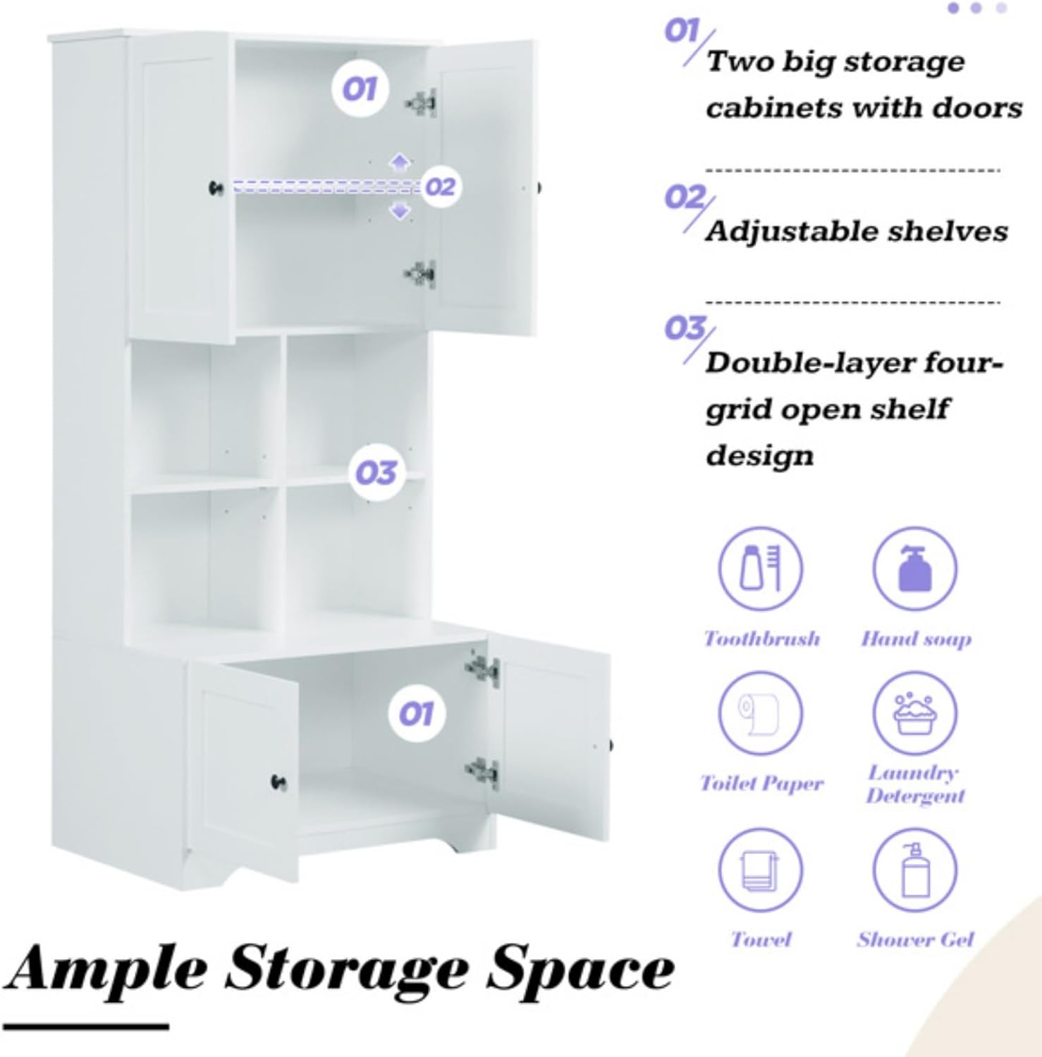 This bathroom cabinet features an upper cabinet, a lower cabinet, and four separate open storage compartments, providing ample space for your hair dryer, towels, cosmetics, shower supplies, and more. Color: White Material: MDF board, painted finish Shape: Rectangular Capacity: 44 lbs/shelf, 220 lbs total Adjustable shelves: Yes Number of doors: 4 Anti-dumping device: Yes Package includes: Cabinet, hardware, instructions Assembly required: Yes