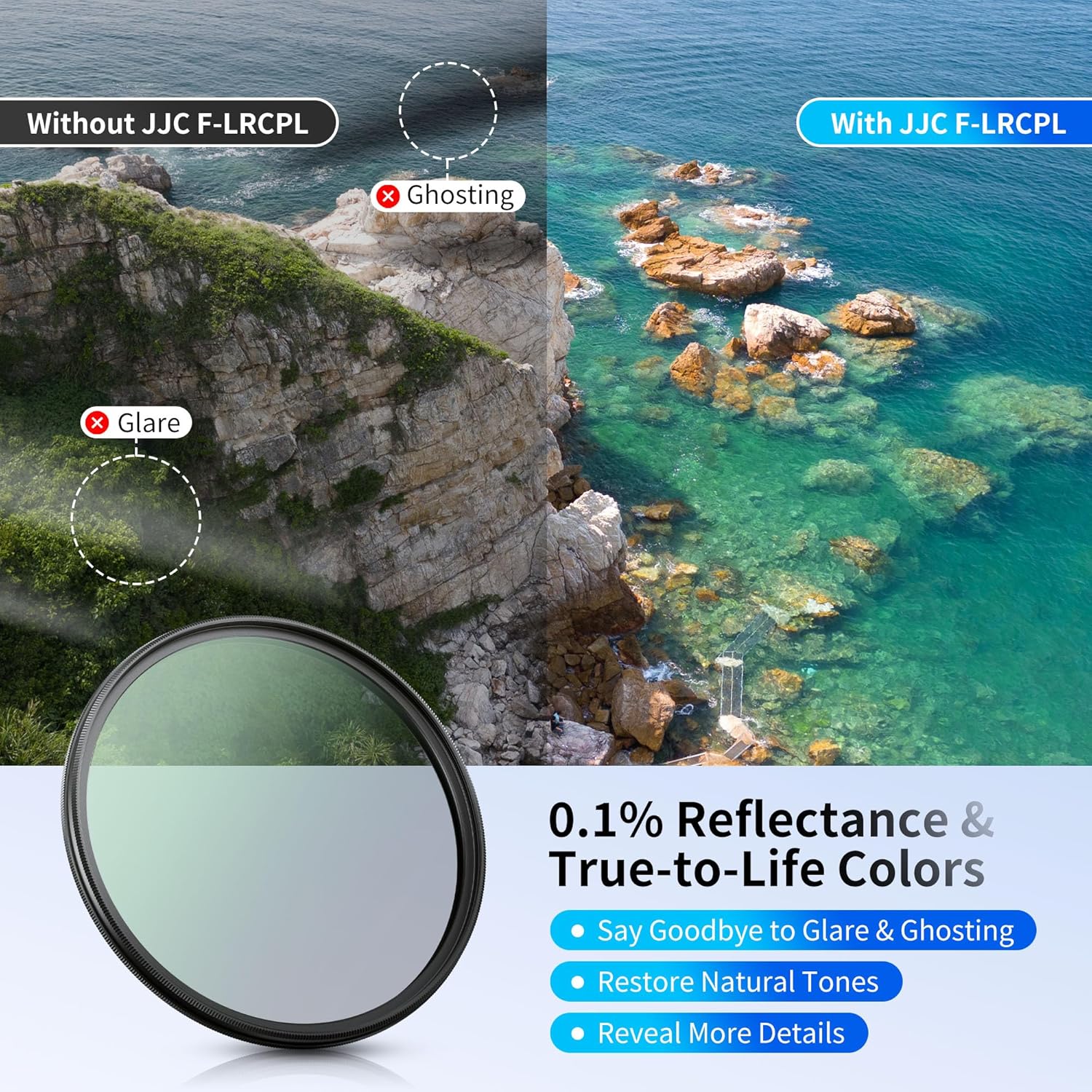 • 【Ultra Low Reflectivity CPL Filter】:The ultra-low reflection filter controls reflection at 0.1%, effectively reducing lens reflections and halo effects, restoring natural tones, delivering clearer images, higher contrast, and richer details, even under complex multi-angle lighting conditions.