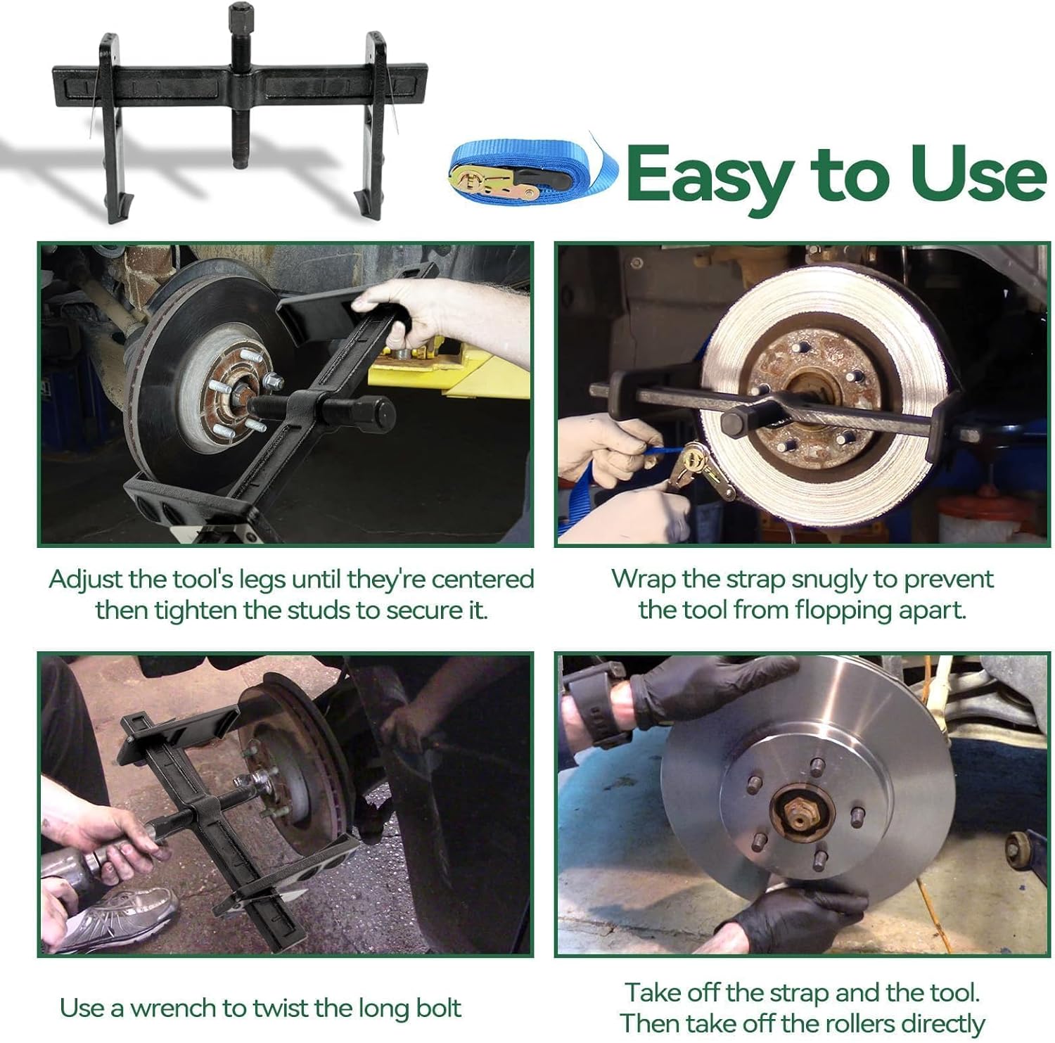Why Choose Our Heavy-Duty Rusted Puller Tool?Engineered for professional mechanics and DIY enthusiasts alike, this powerful puller tool is the ultimate solution for removing stubborn, rusted components with ease. Its robust construction and versatile design make it an indispensable addition to any toolbox, tackling jobs that other tools simply cannot.Key Features:Powerful Rust Removal - Effortlessly extract seized brake drums, rotors, gears, and large pulleys. This heavy-duty puller tool is ideal for stubborn, rusted components that won't budge with standard methods.Compact & Versatile - Its slim puller jaws fit tight, hard-to-reach spaces. The included nylon strap securely grips heavily rusted drums. It is also compatible with air tools for faster, more efficient work.Adjustable Sliding Jaws - A spring-clip mechanism keeps the jaws firmly locked in place. At the same time, it allows for smooth sliding adjustments to deliver powerful, precise gripping on any component.Heavy-Duty Construction - Built from reinforced steel with a durable black oxide coating. This construction resists rust, ensuring the tool provides years of reliable performance in demanding conditions.Complete Kit - The kit includes one high-strength puller and one nylon strap. It is ready for immediate use on a wide range of automotive, industrial, and mechanical repair jobs.Why It's Essential:Effortlessly extract seized brake drums, rotors, gears, and large pulleys; this heavy-duty puller tool is ideal for stubborn, rusted components that won't budge with standard methods.Its slim puller jaws fit tight, hard-to-reach spaces, and the included nylon strap securely grips heavily rusted drums; it is also compatible with air tools for faster, more efficient work.A spring-clip mechanism keeps the jaws firmly locked in place, while allowing for smooth sliding adjustments to deliver powerful, precise gripping on any component.Built from reinforced steel with a durable black oxide coating, this construction resists rust, ensuring the tool provides years of reliable performance in demanding conditions.The kit includes one high-strength puller and one nylon strap, and it is ready for immediate use on a wide range of automotive, industrial, and mechanical repair jobs.Ideal for automotive and industrial repair professionals, this heavy-duty puller tool is designed to save time and effort by tackling the most challenging rusted and seized components.