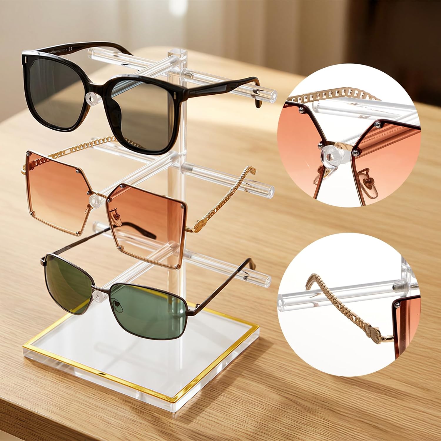 6pcs Gold Acrylic Display Risers & 3-Tier Gold Trim Sunglasses Stand Combo, Eyeglasses Organizer for Retail & Home Decor