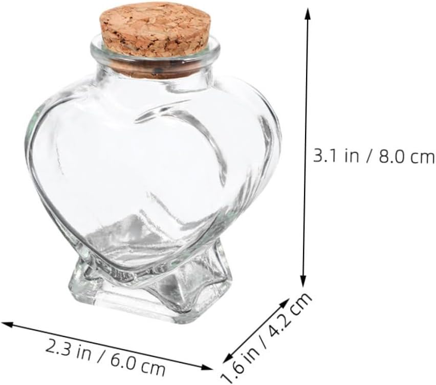 Package List 6 x Heart Glass Bottles Features -Convenient to carry: their small size and lightweight nature make them easy to carry in pockets or bags, fit for on the go use corked glass bottle -Material:Glass+wood glass heart jar -Size:8.00X6.00X4.20cm/3.14X2.36X1.65in glass bottle for DIY crafts -Multipurpose: suitable for holding small items like candies, jewelry, or wish notes, making them versatile for various uses glass heart shaped jar -Thoughtful present: these bottles make a thoughtful favor for friends, family, or partners, expressing your affection in a unique way empty jar for storage -sturdy glass: crafted from glass, these bottles are built to last and resist damage, ensuring they remain intact heart-shaped bottles -Product Info:Heart glass bottle -Charming appearance: the heart shaped design of these glass bottles with cork stoppers adds a cute and romantic touch to any decor heart shaped glass bottle -Color:Transparent heart shaped glass jarGoods Descriptiondecorative glass bottle Use them as unique centerpieces, party favors, or even as part of a DIY craft project.wedding decor bottle The cork stopper adds a rustic touch, making these bottles versatile for various themes and occasions.empty jar for storage The heart-shaped design of these glass bottles makes them a charming addition to any wedding or party decoration