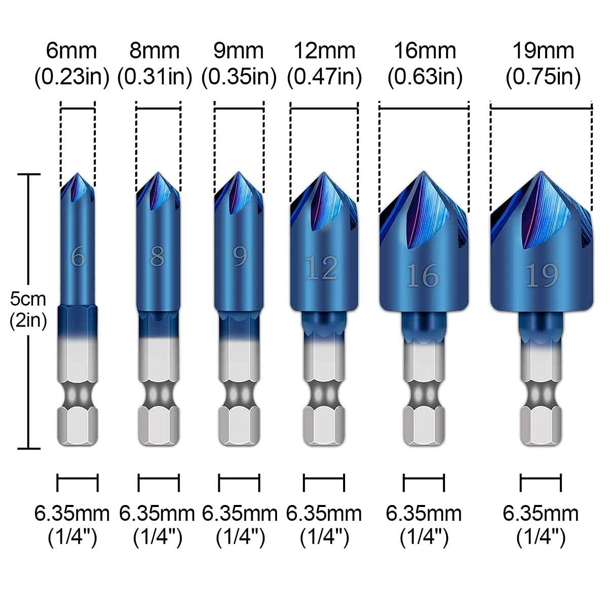 6 Commonly used Sizes】 This flute countersinking toolset has 6pcs drill bits, including 6mm(1/4''), 8mm(5/16''), 9mm(3/8''), 12mm(1/2''), 16mm(5/8'') and 19mm(3/4''). The length of the countersink drill bit is 6.35mm with 1/4" Hex Shank. They can meet your various needs in different situations.Material】Made of standard high-speed steel with high-frequency quenching for heat treatment, the HSS countersink bits have high hardness and toughness. Coated by , the chamfer cutter kit is rustproof, high wear-resistant, and has a long service life.Advantage】During use, cutting edges can better chip evacuation, the cutting edges are not easy to blunt! There're numbers the corresponding countersink hole cutters, so it's convenient for you to pick out the you need quickly.Excellent Performance】1/4 inch quick-change hex shank, five-blade chamfering with groove, 90° angle the point for and precise countersinking. Great for Sinking 90 Degree Holes into Wood and Soft Metals.Widely Used】Works great with all kinds of materials and surfaces, like woods, MDF, particle boards, plywood, panels, softwood, hardwood, and many others.DIY Supplies: MetalworkingType: Countersink Drill Bitlength: 5cmMaterial: High Carbon SteelNo need for shaking or reducing friction, capable of withstanding heavy-load operations, making the cutting process smoother