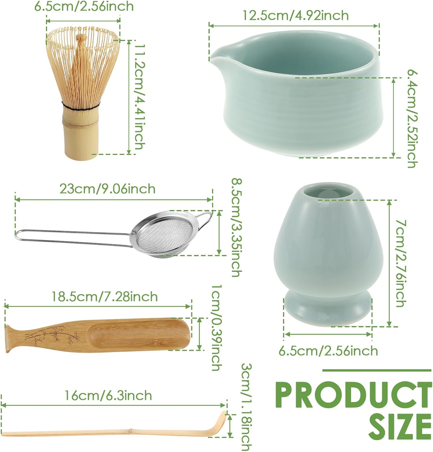 Parts List:1 × Ceramic Bowl1 × Matcha Whisk1 × Matcha Whisk Storage Holder1 × Matcha Sifter1 × Tea Scoop1 × Matcha SpoonDescription:If you are also interested in Japanese matcha culture, try this matcha making kit. It contains all the tea cooking tools so that you can make matcha drinks in the traditional wayKey Feature:Practical Tea Making Tools: This kit contains the tools to make matcha tea in a complete way, making it easy for you to experience the whole process of making matcha teaSpecification:Product Name: Matcha Whisk SetColor: GreenMaterial: CeramicSize:Ceramic Bowl: 12.5 x 6.4 cm / 4.9 x 2.5 inchesMatcha Whisk: 6.5 x 11.2 cm / 2.56 x 4.4 inchesCeramic Whisk Holder: 6.5 x 7 cm / 2.56 x 2.76 inchesTea Strainer: 23 x 8.5 cm / 9 x 3.3 inchesTea Spoon: 16 x 3 cm / 6.3 x 1.18 inchesMatcha Spoon: 18.5 x 1 cm / 7.28 x 0.39 inchesNote:1.There may be slight differences between the picture and the actual color of the commodity. We will try our best to show you the exact color.2.Please allow slight dimension differences due to manual measurement.