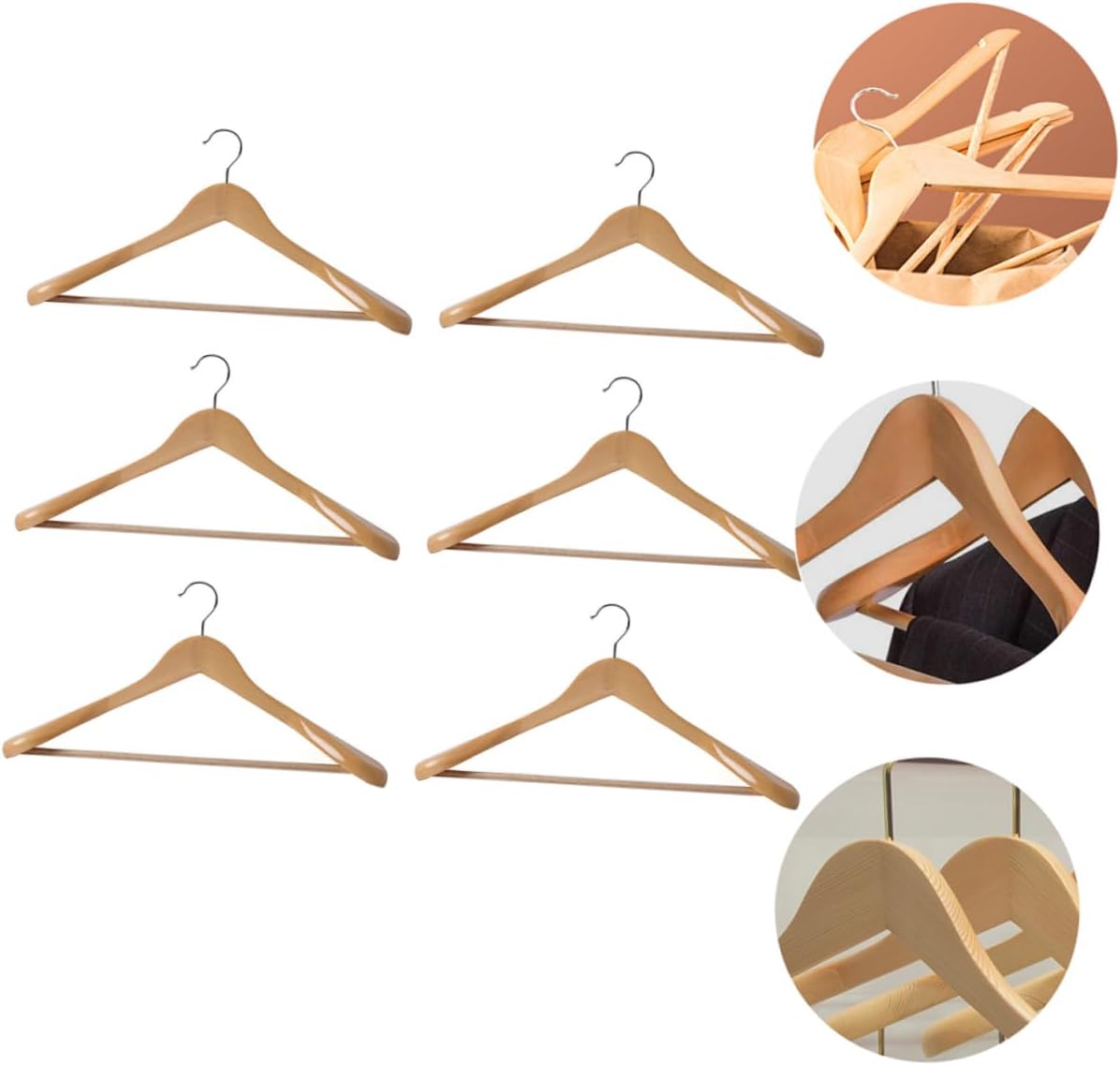 Package Include 6 x Wood Hangers Characteristics - Material: Stainless Steel + Wood Hotel Clothes Hooks. -Product Info:Solid wood coat rack - Perfect for adult use, can be used for home, hotel, dorm and some other proper places Clothes Drying Rack. - Suitable for dry clothes an also storage clothes in wardrobe Wooden Hangers. - Fine polishing process, smooth and mellow, great hand feeling without parts Retro Hangers. - The material is premium wood material, healthy and environmentally-friendly, no harm to people Wooden Coat Hangers. - Smooth lines show retro and plain life, easy to match with your closet style Coat Hangers.Goods InformationClothing Showcase Racks This is a set of solid wood coat hangers.Retro Hangers The anti-skid design will protect your clothes from falling off and being dirty.Coat Hanging Hooks Manufactured with premium wood material, and practical enough to use.Hotel Clothes Hooks Great for maximizing space in small closets