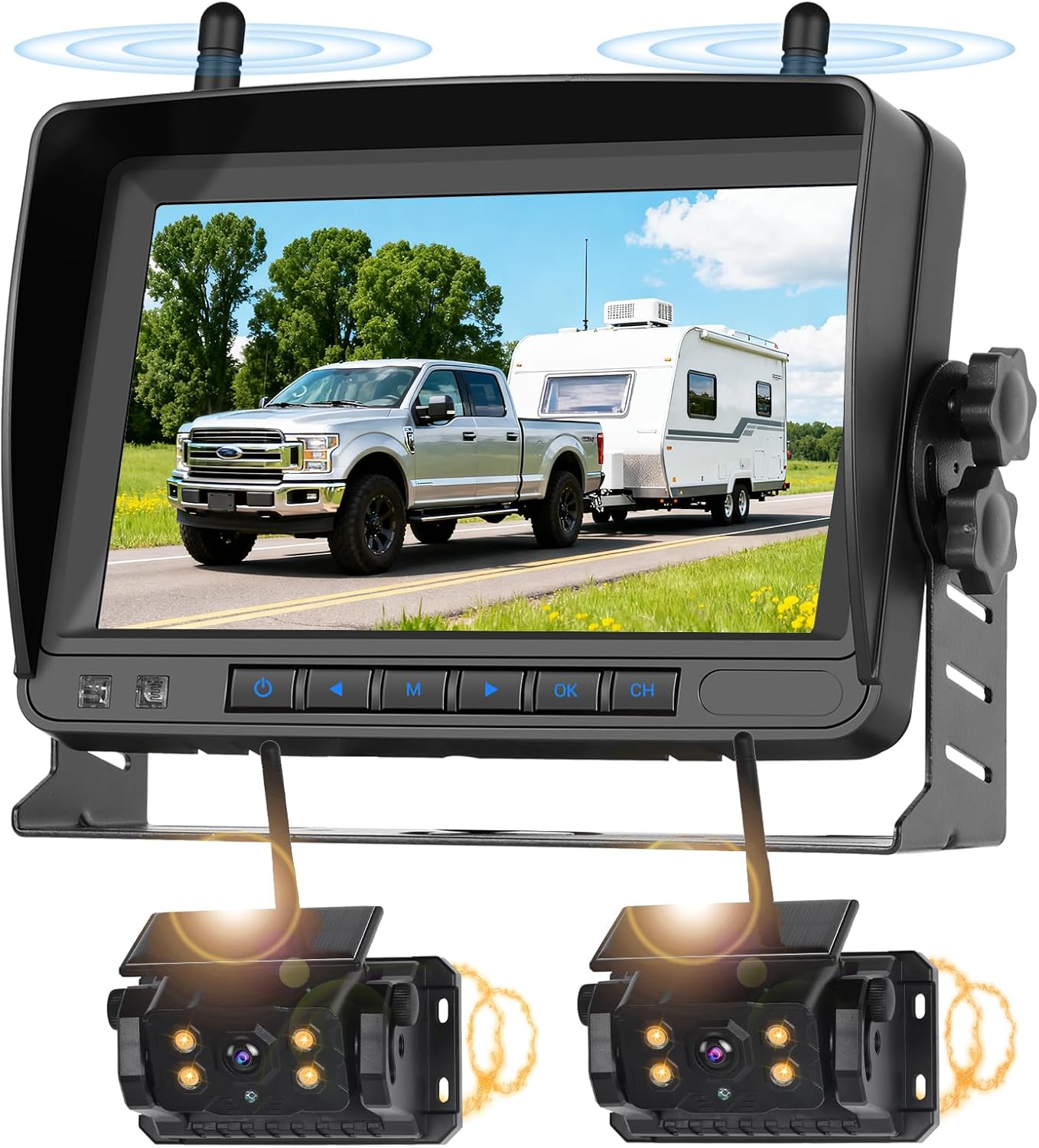 Camera Features:Features: Wireless connectivity, night vision, magnetic mounting; Auto Automatic gain control,Auto White Balance: Power Supply: Solar/Type-C ChargingChips components: 2053 Effective pixels: 1080PSignal format: PAL/NTSCVideo output: AHD Video SignalLens: 17MMWorking temperature: -30°C ~ +60 °CHorizontal resolution: 1000 TV LineMinimum illumination: "Lu×/F1.2(IRON)Signal to noise ratio: >48dBGamma correction: >0.45Light exposure mode: Electronic exposureAmbient relative humidity: 30%-80%Day and night mode: Full color during the day, black and white at nightMonitor Features:Monitor Video signal: Supports AHD Digital signalsScreen size: HD Full View Digital IPS ScreenScreen Brightness: 500CD/M2, The Clearest Video ImageEffective pixels of the screen: 1024*600PVideo Recording: Support MAX128GB SD CardPower supply voltage: DC12V-36VImage: Up/Down/Left/RightSignal format: PAL/NTSCBrightness: AdjustableContrast: adjustableChroma: AdjustableCamera delay: adjustableTime: AdjustableDVR: SupportedReversing cable: Open/close (width, height, left and right adjustable)Features:Loop recording,Formatting,Video playbackLanguages: English, Japanese, Russian, Spanish, Italian, German, French,Portuguese,Korean,Finnish,DutchPackage included:Color 1080P Weatherproof Wireless Backup CameraWireless Antennas7” Wireless Color LCD MonitorCar cigarette lighterSunshadeUniversal Mount With Adhesive PadCamera Power CableScrew Kit for Camera InstallationType-c Power cableChargerSpecification