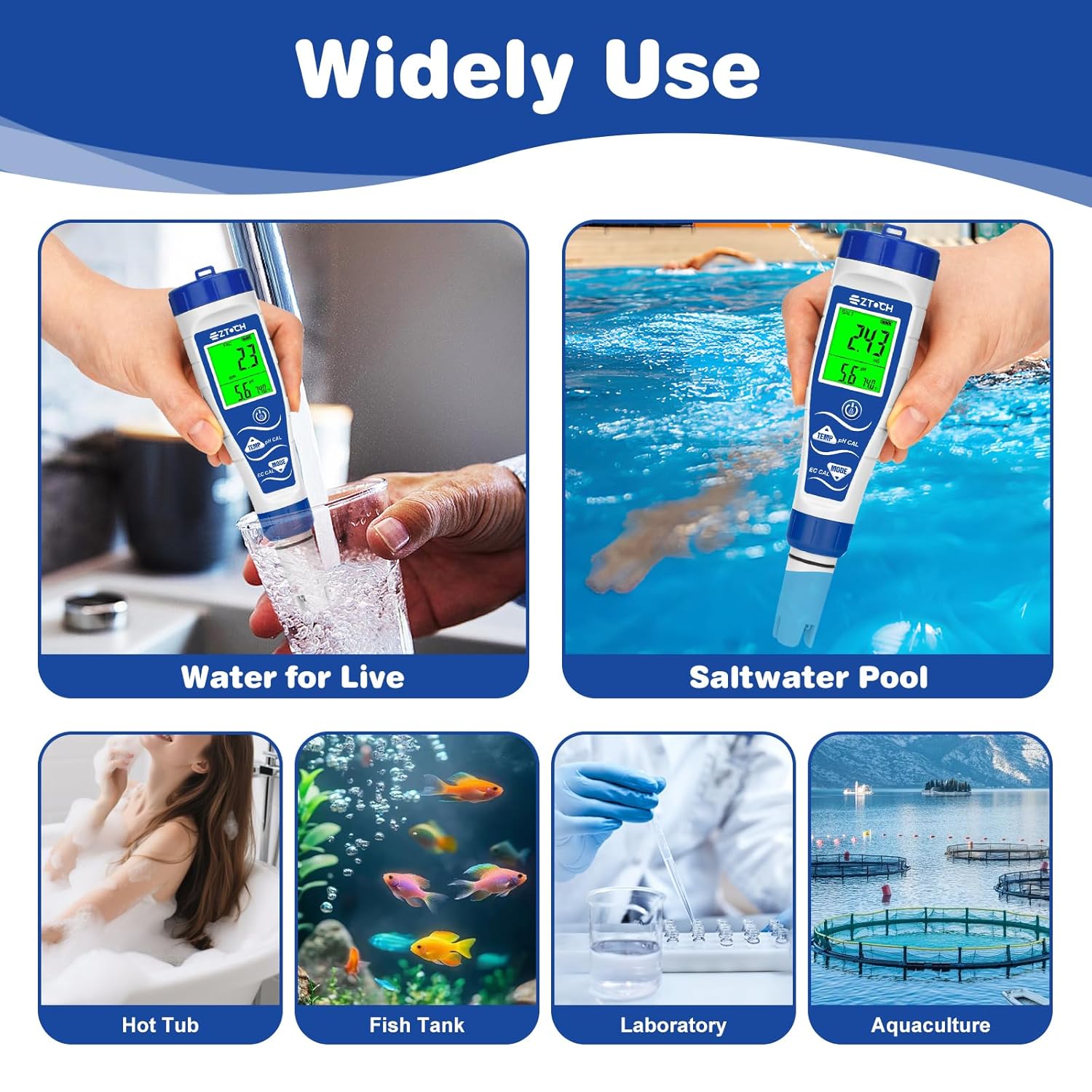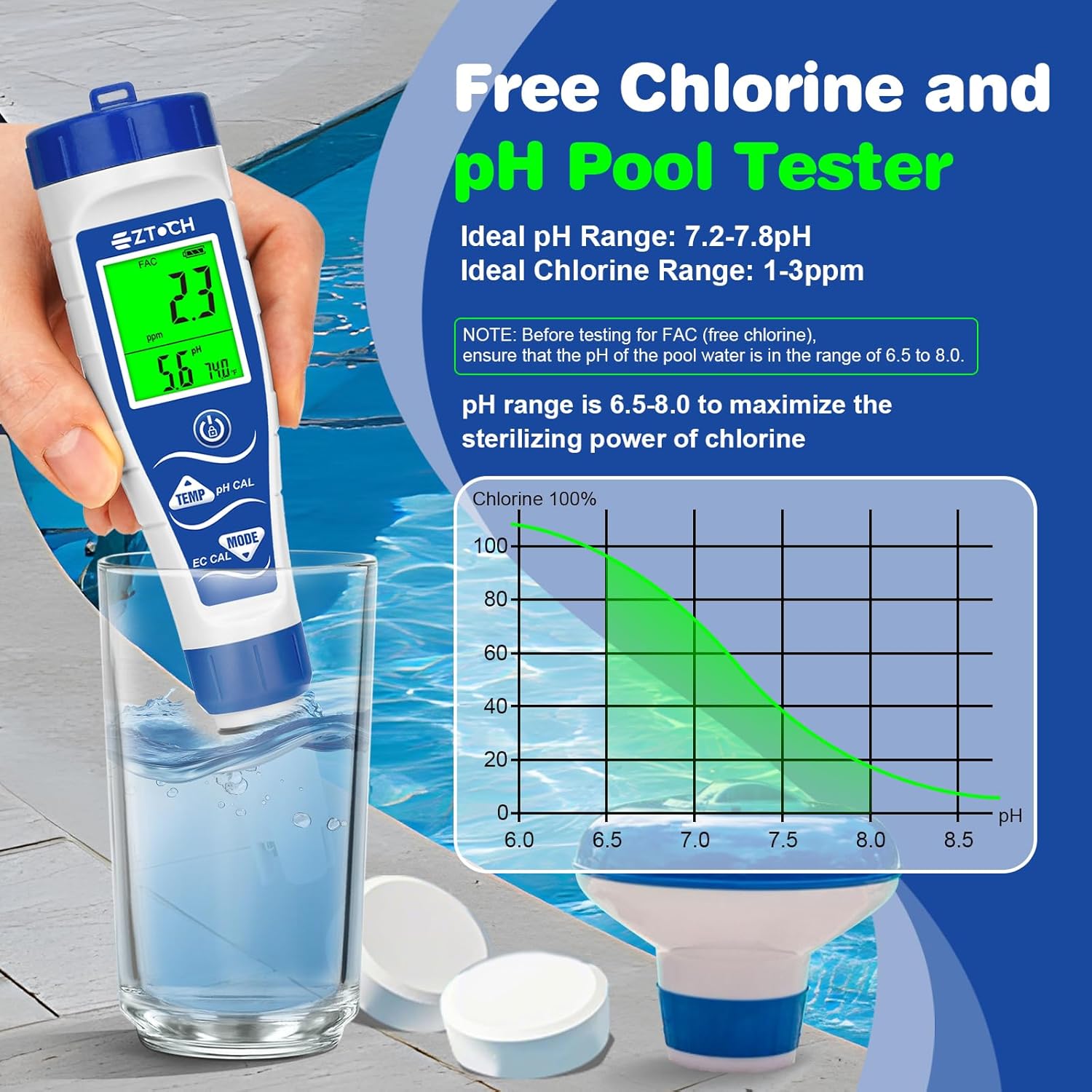 7 in 1 pH Chlorine Salinity EC TDS ORP Temperature Meter with pH4+7+10 Calibration Solution, Each Bottles 50ml, with pH Electrode Cleaning Solution