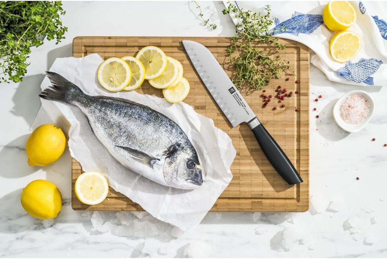 Express yourself with 6 end cap color choices Ice-hardened FRIODUR blade stays sharper, longer 100% plastic-free and FSC certified packaging With its thin, razor-sharp blade, this 7-inch santoku knife is perfect for precision kitchen tasks. Santoku - Japanese for "three virtues" - excels at three cutting techniques: expertly mince shallots, slice cucumber, and dice onions with this Asian-style all-rounder. The hollow edge blade has small indentations, known as grantons, that prevent food from sticking while cutting. Find the perfect fit for your home kitchen with All*Star knives. Choose your own end cap color for a personal touch. The newly designed, ergonomic handles are shaped for the most comfortable grip. They hug exceptional German blades that are precision forged from a single piece of special formula steel. Combined with ZWILLING’s signature ice-hardening technique, these FRIODUR blades are harder, sharper, they will not stain or chip, and they retain their sharpness longer. Each All*Star knife comes in 100% plastic-free packaging so you can cut in good conscience. Premium black logo end cap for a personalized touch Ergonomic handle fits comfortably in the hand Made from special formula high carbon stainless steel Precision-honed blade and laser-controlled edge for superior sharpness SIGMAFORGE - Single piece, forged knife 100% plastic-free packaging Dishwasher safe, handwashing recommended Made in Germany ZWILLING ALL*STAR Knives Choose your color, express yourself. Get to know the new ZWILLING ALL*STAR series and pick your new knives in the color that will accompany you through your kitchen adventures to come. The knives are available with premium logo applications in various trendy colors and therefore set a stylish, individual color highlight that exactly matches you and your kitchen. Inspiring quality The ZWILLING ALL*STAR knives are forged from stainless ZWILLING special formula steel and offer the optimum blade edge angle. Everything in hand The knives from the ZWILLING ALL*STAR series have a newly designed ergonomic handle that makes them particularly easy to work with. Sustainably packaged New, 100% plastic-free sustainable packaging has been developed for the knives and knife sets in the ZWILLING ALL*STAR series.