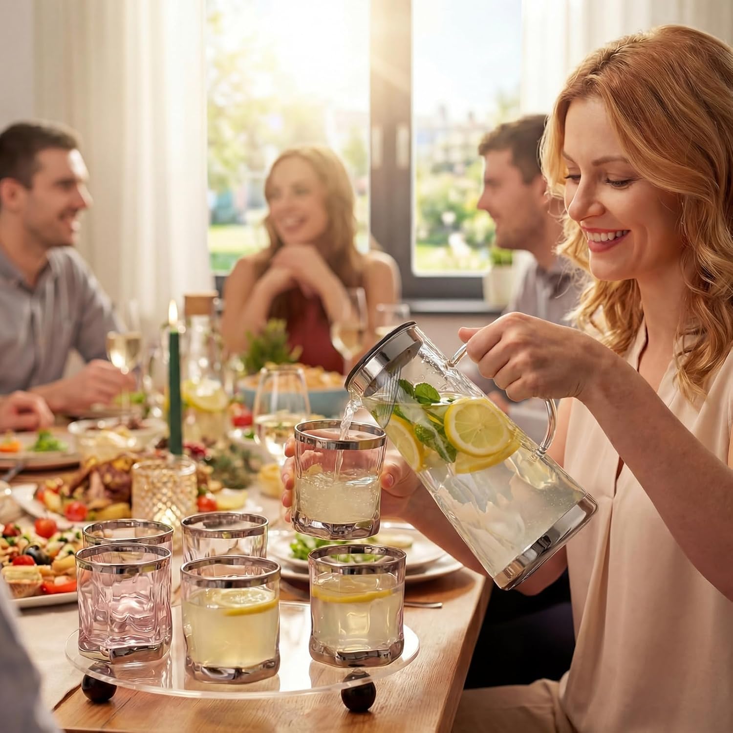 Features: Enjoy Your Homemade Fruit Infused Water: Ideal for everyday use or entertaining guests, this jug is perfect for a variety of drinks such as iced tea, margaritas, juice, coffee, sangrias, wine, etc. Perfect for parties, baby or bridal showers, birthdays, BBQs, or simply for everyday use Specifications: Material: glass Color: grey Size: pitcher: 57.5 oz Package includes: 1 x Pitcher 6 x Cups Notes: Manual measurement, please allow slight errors on size. The color may exist a slight difference due to different screen displays