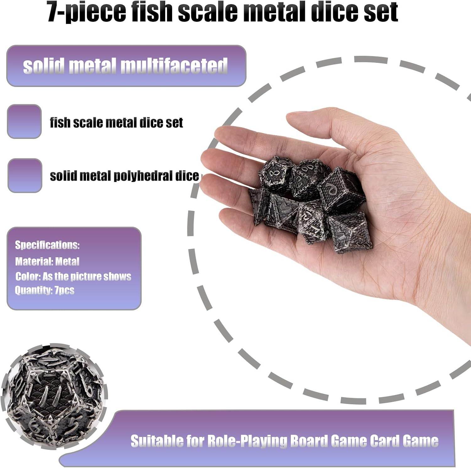 Description:NEW STYLE: This is the Fish Scale Metal Dice Set. These dice are eye catching and can get lots of compliments at the table.GREAT IN HAND: There are bigger but lighter than metal dice .The weight of the Dice set is only 190g/6.7oz.Specification:Specifications:Material: MetalColor: As the picture showsQuantity: 7pcsPackage Includes:1 Piece 4 Surface Sieve1 Piece 6 Surface Sieve(1-6)1 Piece 8 Surface Sieve(1-8)2 Piece 10 Surface Sieve(0-9/00-90)1 Piece 12 Surface Sieve(1-12)1 Piece 20 Surface Sieve(1-20)1 Piece tray