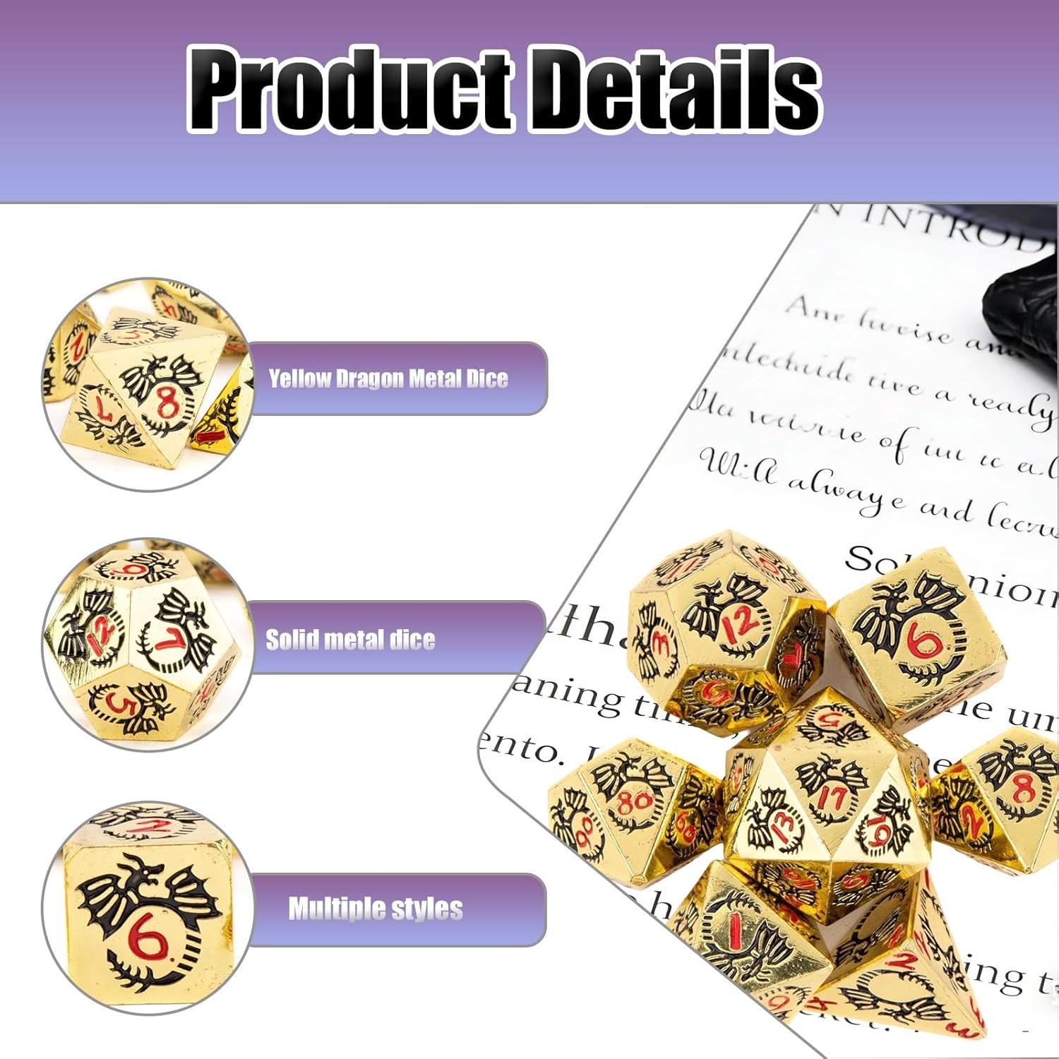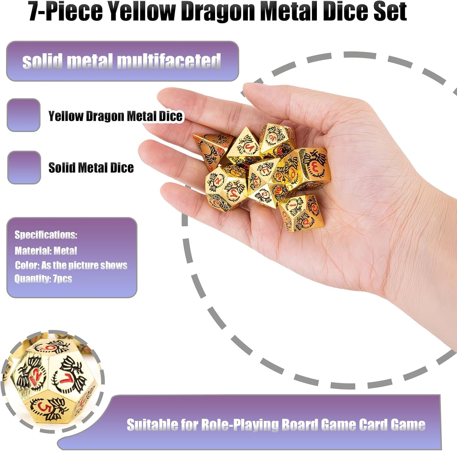 Description:NEW STYLE: This is the Yellow Dragon Metal Dice Set. These dice are eye catching and can get lots of compliments at the table.GREAT IN HAND: There are bigger but lighter than metal dice .The weight of the Dice set is only 190g/6.7oz.Specification:Specifications:Material: MetalColor: As the picture showsQuantity: 7pcsPackage Includes:1 Piece 4 Surface Sieve1 Piece 6 Surface Sieve(1-6)1 Piece 8 Surface Sieve(1-8)2 Piece 10 Surface Sieve(0-9/00-90)1 Piece 12 Surface Sieve(1-12)1 Piece 20 Surface Sieve(1-20)1 Piece tray