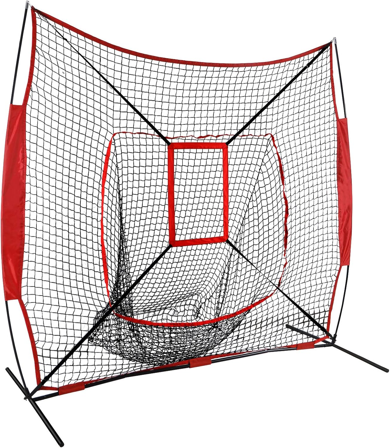 Features: Rugged powder-coated steel frame and resilient fiberglass tension rods.Thick, tear-resistant polyester mesh to withstand impact from hitting and pitching into the net.Fully stabilized support with rubber feet and four steel ground stakes.Strike zone for more focused and targeted shots.No tools required. Easy to assemble.Comes with carry bag for easy transport and storage.Specifications:Dimension:7.3 x 3.6 x 7'Mesh Size:1.6 x 1.6"U-Shape Stake Length: 9.3"Strike Zone Size:23.2 x 19.3" (LxW)Base Bar Length:29.5"Color: Reddish BlackMaterial: Glass Fiber & Polyester & PP & LeatherPackage Includes:1 x Baseball Practice Net1 x Carry Case4 x U-Shape Stake1 X Base and Frame1 X Strike Zone TargetSpecifications:Color: blackMaterial: Mainly Steel(Body) + Durable PlasticAdjustable height: 28" - 42"Product Weight: 4lbs
