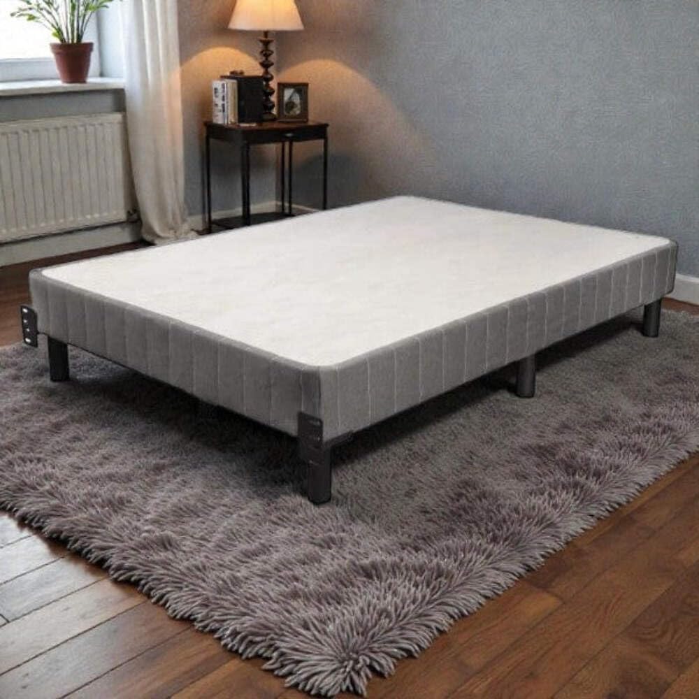 Flexible Mattress FoundationThis metal box spring foundation features heavy-duty steel construction with grey fabric covering. Includes headboard brackets and optional legs to convert into a 14 inch platform bed. Designed for tool-free assembly and stable mattress support. Suitable for everyday bedroom use.