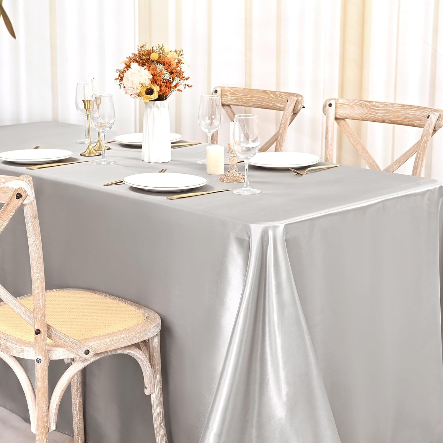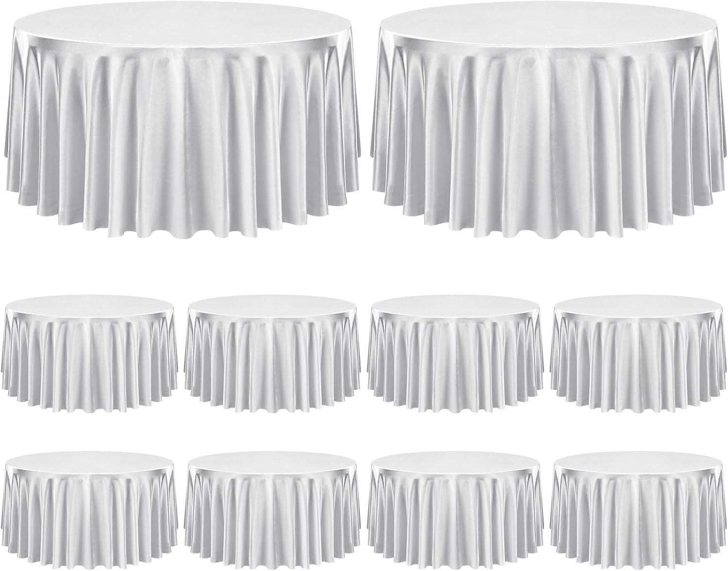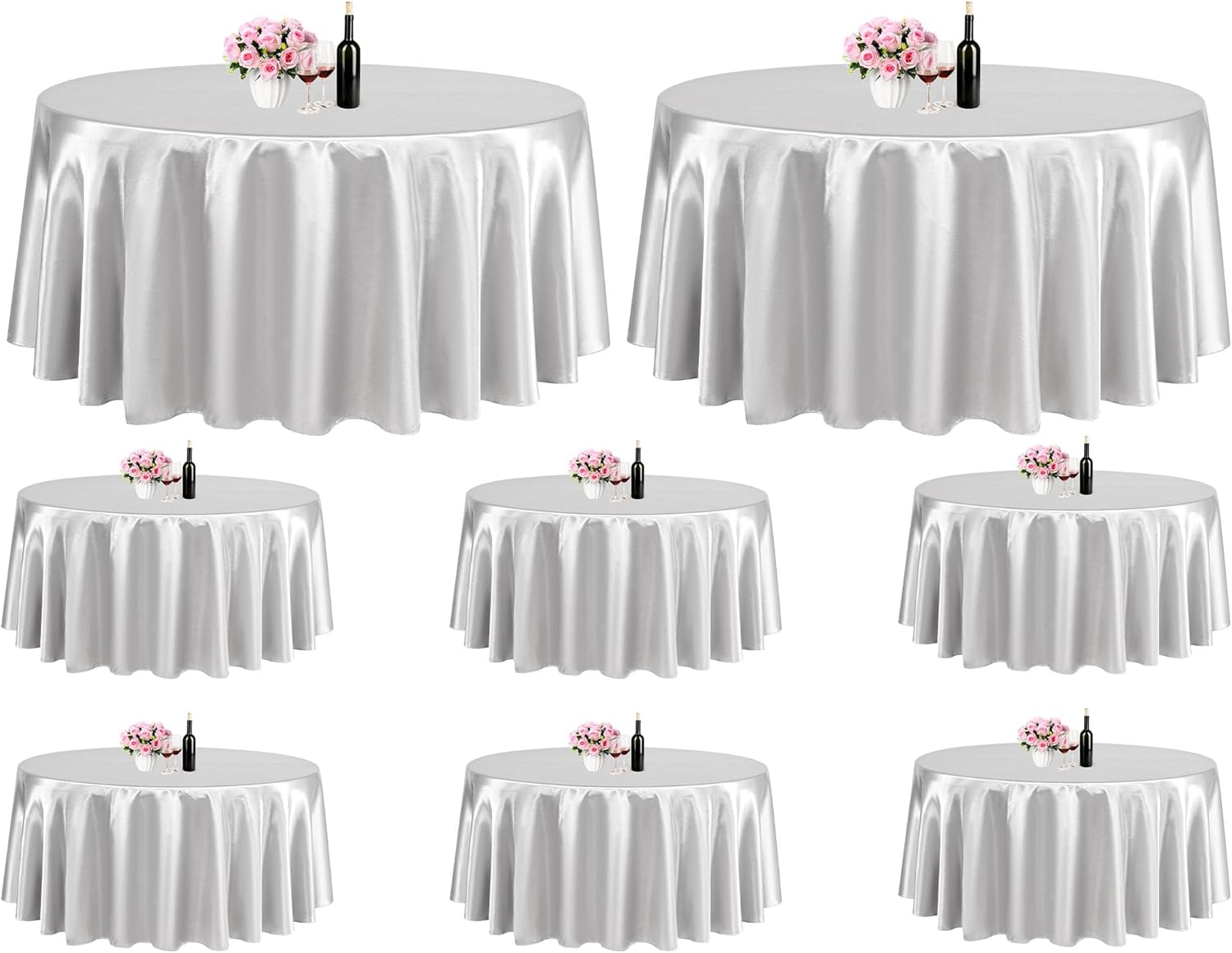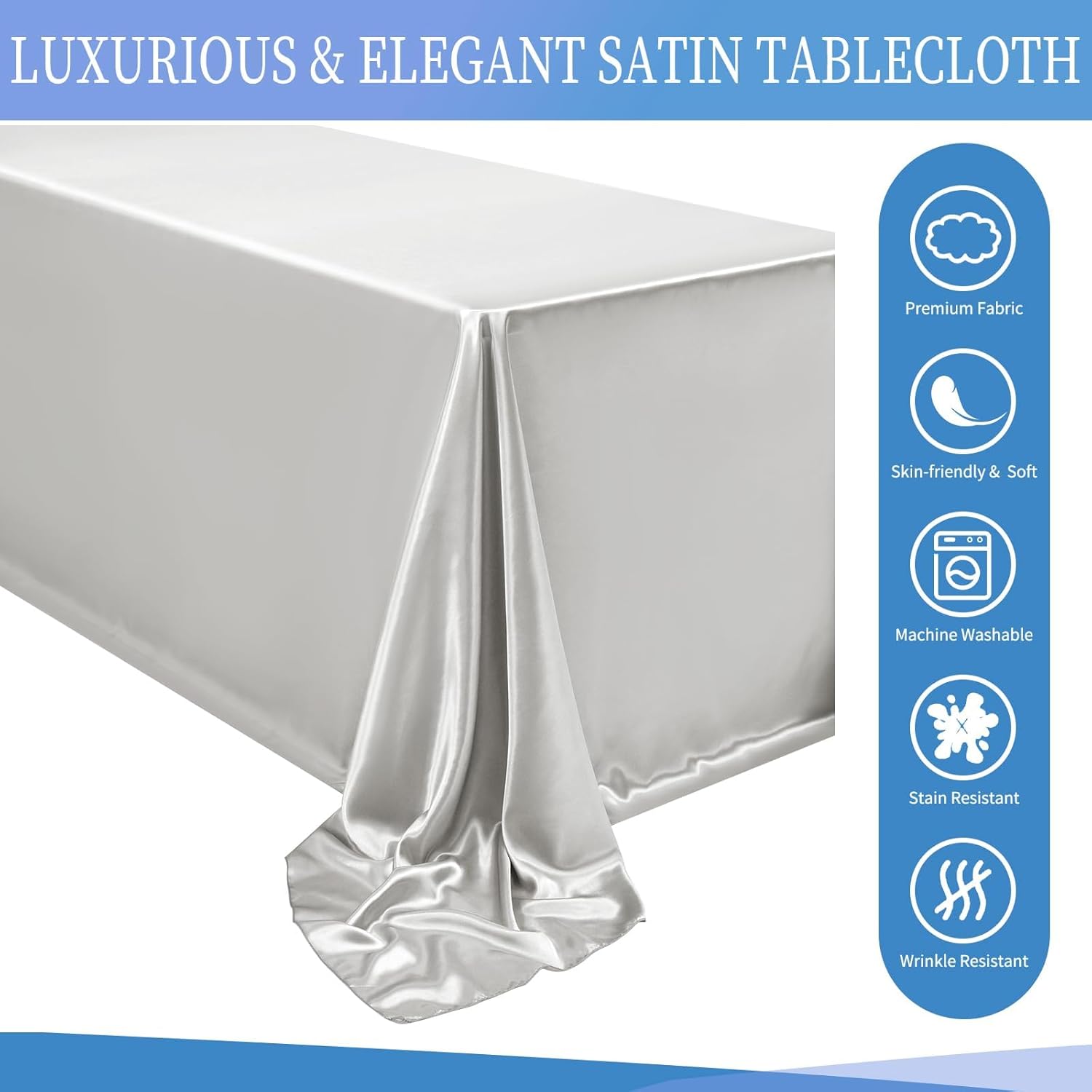 Our rectangular tablecloth features a seamless design for an elegant look.Our satin fabric table cloth complements any dinnerware, simple and versatile. 90 x 156 inch satin tablecloths are popular in weddings and special events due to their glimmering, silky-soft beauty.Tablecloths are made of satin and are designed to be stain resistant, and can be laundered countless timesThey are designed to line with the most common tables in banquet halls and wedding reception centers, which are standard rectangular tables with a height of 30 inches and a length of 96 inches.Specifications:Material: 100% SatinColor: SilverDimensions: 90 x 156 inchesThickness: 180 gsm.Package includes8 X Satin TableclothHow to choose a suitable tablecloth for your table?Measure the wide/length of the tableTablecloth Length = Table Length + Drop Length x 2Tablecloth Wide = Table Wide + Drop Length x 2Tips:This is a wrinkle resistant tablecloth. If you find wrinkles in the tablecloth, it is because it was folded and packed. Don't worry. Simply press flat with a low temperature iron to restore the original appearance.Machine washable with cold water in gentle cycle. Use normal detergent. Bleach is not recommended. Don't wash with other materials. Wash like colors together. Tumble dry with low temperature. Warm Notice:1. Manual measurement, there will be an error of 1-2cm.2. The color of the display screen of mobile phone and computer is different, there will be color difference, please understand.3. If you have any questions about the purchase or use of the product, we will provide you with solutions to solve the problem.