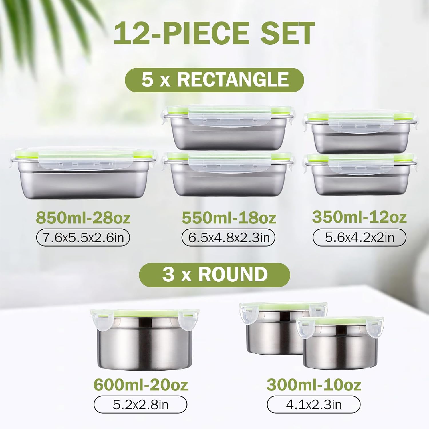 Features: The set includes 8 food storage containers, providing an ample solution for all storage necessities. This complete package ensures customers have a container for every type of meal preparation and storage requirement, making it a versatile addition to any household. These food containers stack neatly in kitchen cabinets, refrigerators, or pantry organizers, making them proper for storing leftovers or planning weekly meals in advance. They slide easily into lunch bags and function seamlessly as both meal preparation containers and food boxes. Ideal for outdoor lunches, they're spacious enough for a generous salad, a hearty sandwich, nuts, and fruits Specifications: Material: 304 Stainless Steel Color: silver, green Size: 2 Rectangular (350ml/12 Oz), 2 Rectangular (550ml/18 Oz), 1 Rectangular (850ml/28 Oz), 2 Round (300ml/10 Oz), and 1 Round (20 Oz) Package includes: 8 x Food storage containers Notes: Manual measurement, please allow slight errors on size. The color may exist a slight difference due to different screen displays