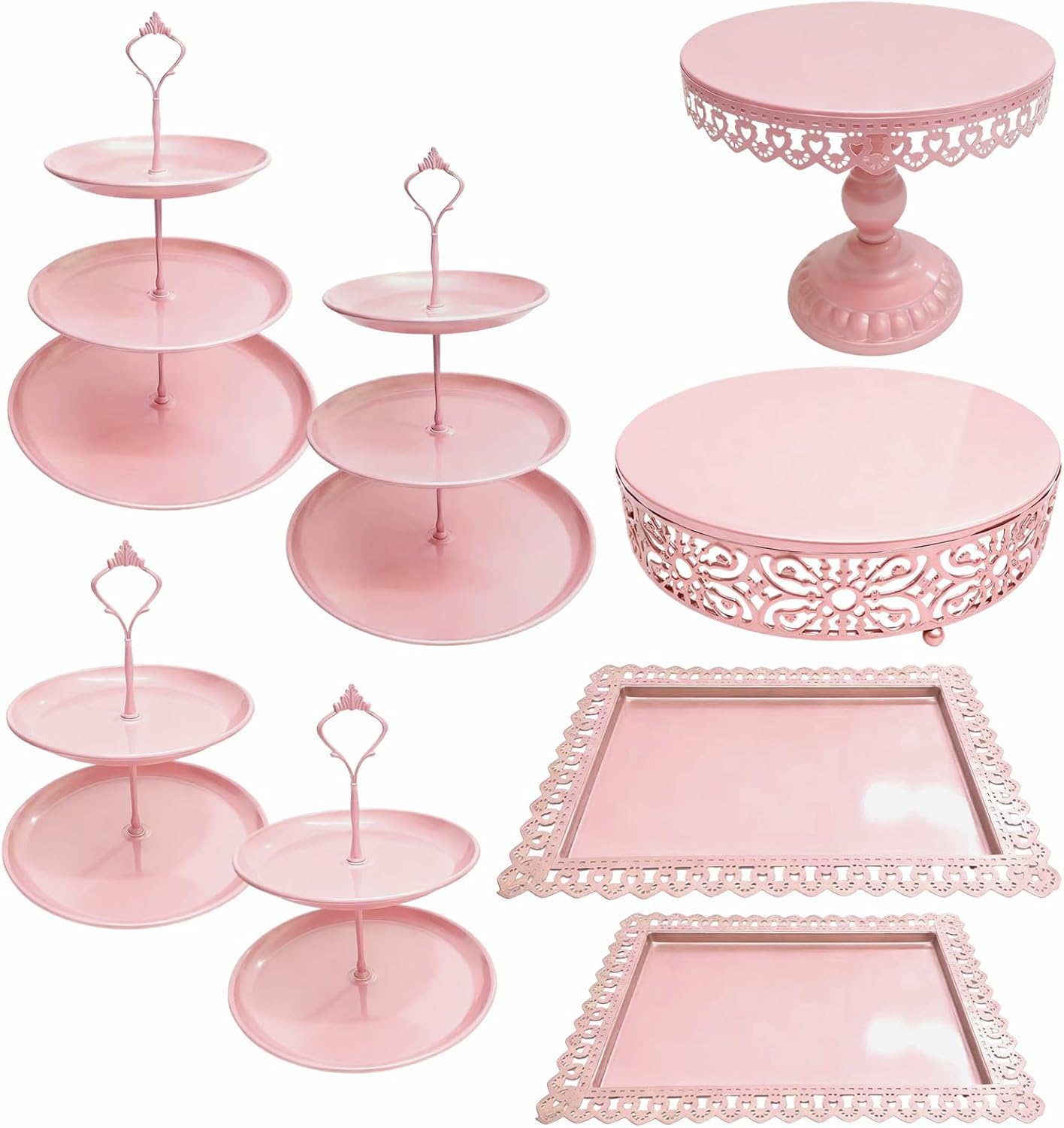 Features: Exquisite design: Luxury silver dessert display, with a simple and generous lace design, creates an elegant and creative European retro romantic style for your party. Widely applied: Suitable for any place, as a wedding cake stand or a dessert display for birthday party, afternoon tea or anniversary, this silver cake stand set can bring you a different surprise. Also, it is ideal as a gift. Specifications: Material: iron metalColor: silverSize: as pictures shownPackage includes: 2 x silver 3 tier cake stands2 x silver 2 tier cake stands1 x Large disc (approx. 12 inches in diameter)1 x Medium tall cake stand (approx. 10 inches in diameter)2 x silver rectangular platesNotes: Manual measurement, please allow slight errors on size. The color may exist a slight difference due to different screen displays.