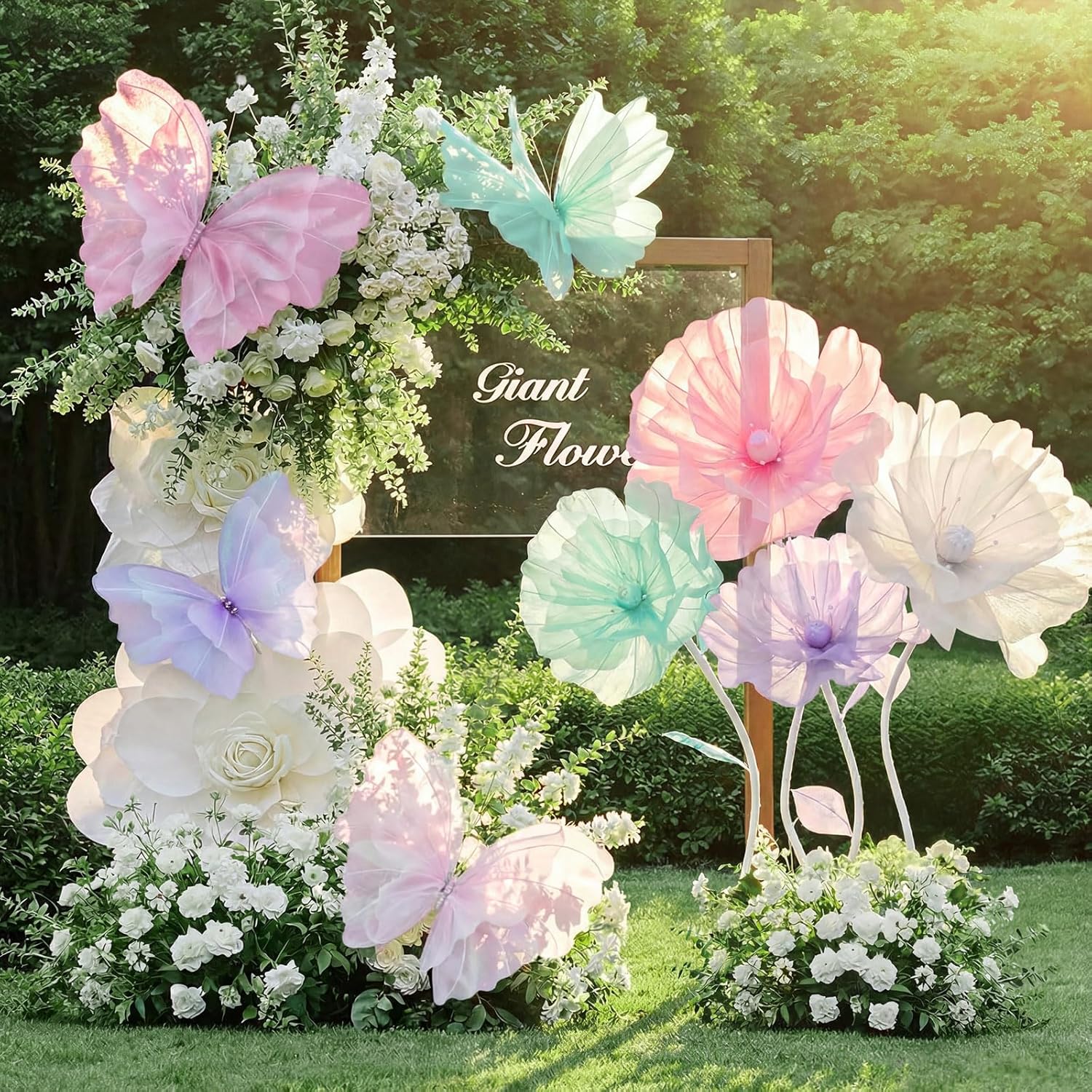 Features: Grand Presence With impressive sizes of about 19.69 inches and 11.81 inches, these 3D flowers and butterflies make a striking addition to any decor scheme. This larger-than-life scale ensures a noticeable impact, catering to those looking for a bold yet sophisticated touch to their interiors or event spaces. Abundance in Every Package Each package includes 8 pcs giant butterfly flower decorations, providing ample decoration options to satisfy even the most creative decor needs. This generous quantity enables customers to explore various arrangements to enhance your home or event, ensuring a comprehensive decorative solution. Specifications: Material: simulated silk Color: white, pink, purple, green Size: about 20 inches, 12 inches Package includes: 4 x Giant flowers for decoration 4 x Large butterfly decorations Notes: Manual measurement, please allow slight errors on size. The color may exist a slight difference due to different screen displays