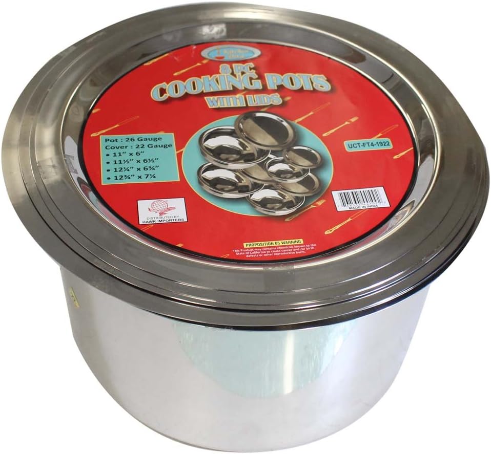 KITCHEN DIVA 8 Piece Stainless Steel Cooking Pots and Lids Set (UCT-FT4-1922). This comprehensive collection is meticulously designed to accommodate a wide range of cooking endeavors, making it an indispensable asset for both household and professional kitchens. Whether orchestrating daily family meals or catering to a large gathering, this set stands as a reliable companion. Encased in a robust 26-gauge stainless steel, the four pots exhibit a remarkable resilience against the daily wear and tear, promising a lasting companionship in your kitchen journey. The pots are available in varying dimensions, including 11" x 6", 11-1/2" x 6-1/2", 12-1/4" x 6-3/4", and 12-3/4" x 7-1/4", thereby offering flexibility to manage different portion sizes effortlessly. Adding a dash of versatility, each pot is accompanied by a flat lid with a subtle indentation, ensuring a snug fit to retain the warmth and flavors of your culinary creations. The lids, fashioned from a 22-gauge stainless steel with a mirror finish, double as elegant serving trays, rendering a functional elegance to your serving table. The thoughtful design extends to storage convenience as well. All pots and lids nestle together in a compact stack, promoting space-efficient storage. This feature is particularly beneficial in professional settings like restaurants or catering services, where space is a premium. Whether you are a novice exploring the culinary world or a seasoned professional, the KITCHEN DIVA 8 Piece Stainless Steel Cooking Pots and Lids Set is engineered to meet your kitchen demands with style and durability.