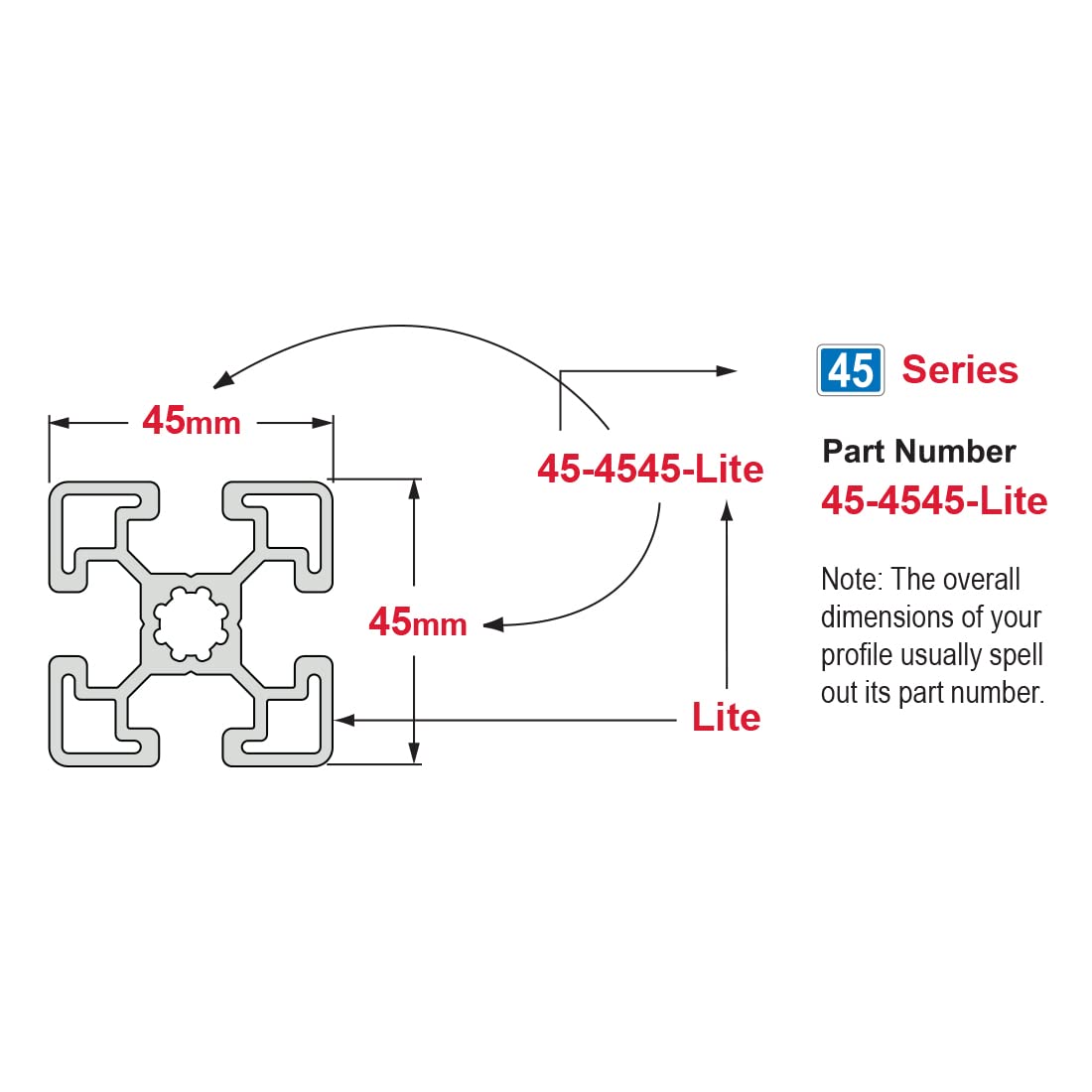 45-4545-Lite is a 45mm x 45mm lite metric 45 series square T-slot profile with four open T-slots, one on each 45mm face. The profile is smooth, which makes it resistant to dirt and debris buildup while also being easy to clean. The 45-4545-Lite profile is compatible with all 45 series fasteners. This light profile lends itself to clean room applications, guards, enclosures, or workstations. The four open T-slots enable access from any direction and are useful for mounting accessories.