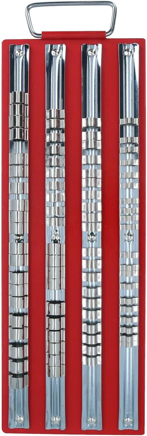 Professional socket rail for commercial or occasional use Socket older storage tray Suitable to hold 80 sockets of different drives Manufactured from chrome vanadium steel for strength and durability Stainless steel clips for maximum strength and durability Holds all types of 1/4", 3/8" and 1/2" drive sockets Spring tension clips for added strength to prevent the sockets from falling off easily Solid steel construction of the rack for added strength Suitable for keeping your sockets organised in a tool box or the item also comes with a swivel handle for transporting or for hanging up on walls or flat surfacesDIMENSIONS OF THE RACK 42cm x 15cm 4 socket railsWILL HOLD THE FOLLOWING NUMBER OF SOCKETS 20 x 1/4" drive sockets 30 x 3/8" drive sockets 30 x 1/2" drive sockets