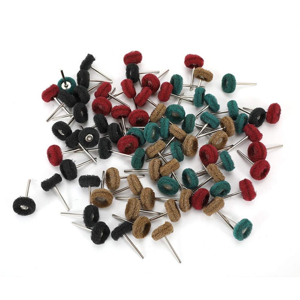 Description Suitable for metal surface , derusting, grinding, , deburring, polishing, stripping residue.Accessories for fine detail work on jade, jewelry, ceramic, glass, wood, hardened steel, cast iron, stainless steel Features- Color: Red, yellow,. green, black.- Size: About 4.5 x 3.5 x 2.5 cm../ 1.77 x 1.37 x 0.98 inch.- Material: Nylon, metal.Package Including 80 x polishing wheel.