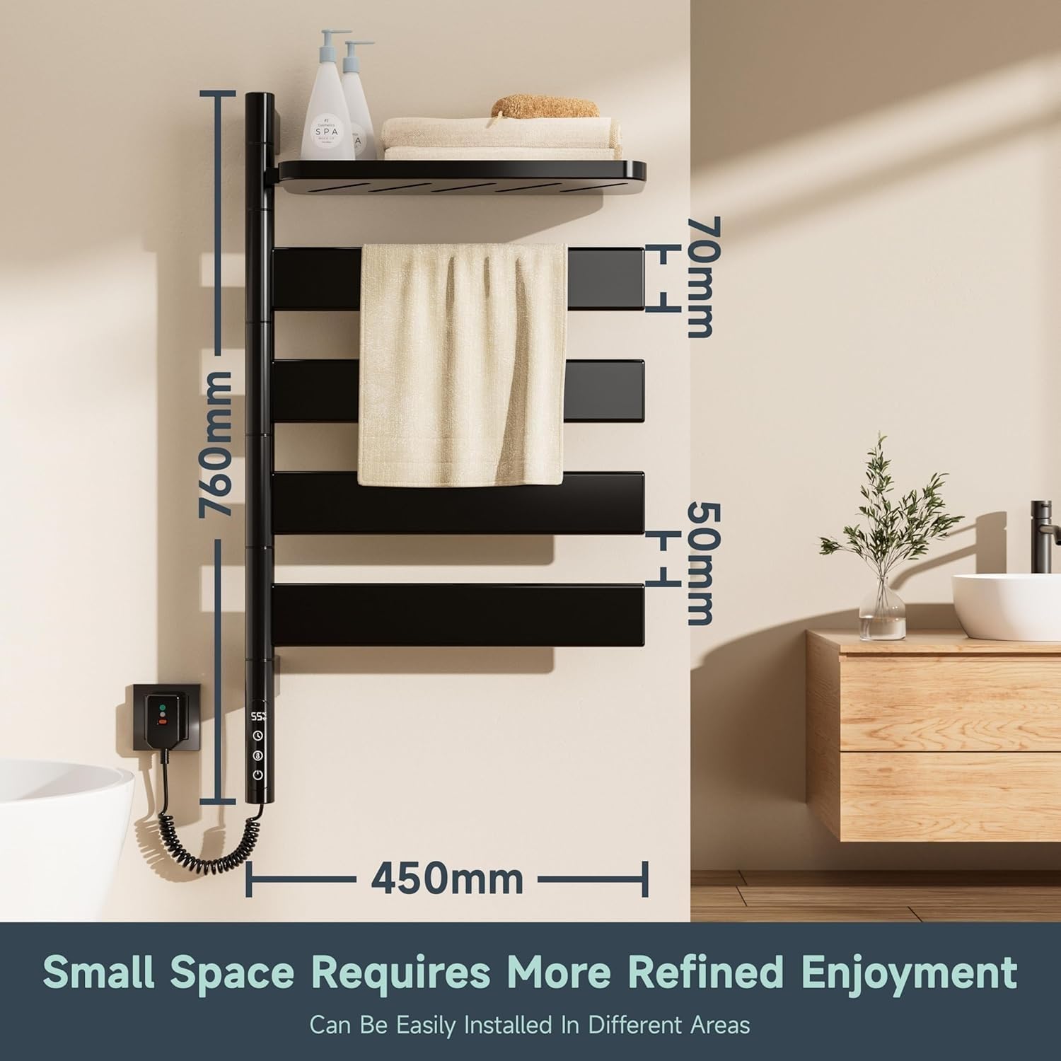 Introducing our innovative Heated Towel Rail, designed to elevate your bathroom experience with its advanced features and thoughtful construction. Perfect for anyone looking to enjoy the luxury of warm towels after a shower, our towel warmer combines functionality and style. **Efficient Carbon Fiber Heating**: Utilizing cutting-edge carbon fiber technology, our towel rail heats up quickly and evenly, ensuring your towels are warm and ready when you need them. The rapid heating feature not only maximizes comfort but also minimizes energy consumption, making it an eco-friendly choice for your home. **Versatile Design**: With a 180° rotatable bracket and layered suspension, this towel rail offers ample hanging space for multiple towels, accommodating your family’s needs. Its sleek and modern design complements any bathroom decor, enhancing both aesthetics and functionality. ** and Reliable**: Crafted from high-quality 304 stainless steel, our towel warmer is built to withstand moisture and daily use without rusting or fading over time. This corrosion-resistant material ensures long-lasting performance in your bathroom environment. **User-Friendly Operation**: The LED touch screen provides a simple and intuitive way to control your towel warmer. With just a light touch, you can easily start the heating process. The adjustable temperature settings range from 30°C to 70°C, allowing you to choose the perfect warmth for your towels. **Convenient Timer Function**: Our towel rail features a customizable timer that can be set from 1 to 9 hours, ensuring your towels are always warm and ready when you are. Simply adjust the timer to fit your schedule and enjoy hassle-free operation. **Waterproof and Safe**: With an IPX7 waterproof rating, our heated towel rail is designed to be safe and reliable, even in the moist bathroom environment. The added leakage protection ensures peace of mind while you enjoy the warmth of your towels. Available in both 4-tier