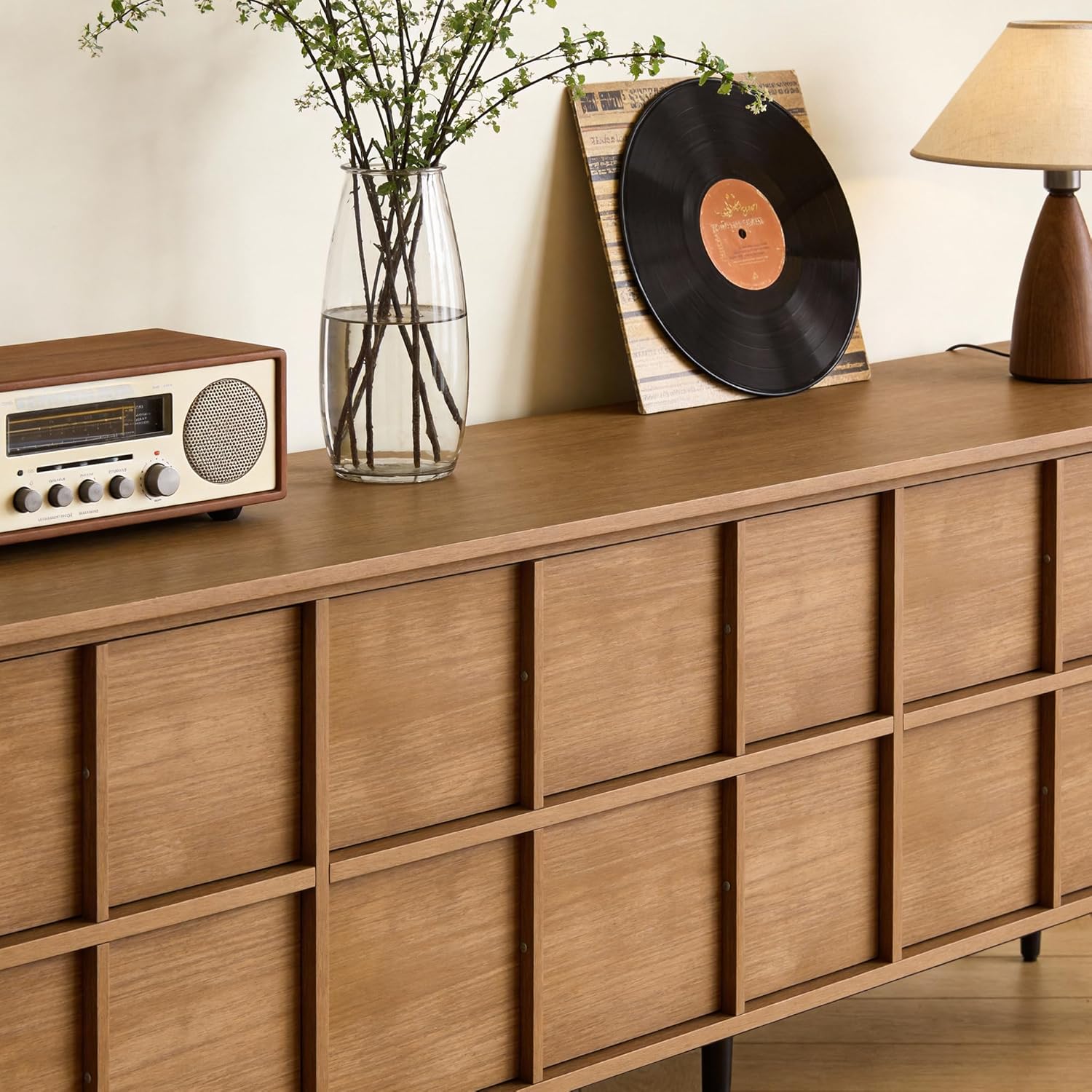 This Mid-Century Modern TV stand seamlessly blends functional storage with artistic, eye-catching design, making it a stylish centerpiece for living rooms, bedrooms, or home entertainment zones. Its six discreet, full-extension drawers offer hidden, clutter-free storage for remotes, cables, and media accessories, maintaining a clean, cohesive look that elevates your space’s aesthetic. Crafted from premium multi-layer solid wood with a genuine wood veneer finish, the surface showcases a rich, natural grain that’s scratch-resistant, wear-proof, and built to last. Sleek metal support legs enhance stability and boost the stand’s overall weight capacity, ensuring it safely holds your large flat-screen TV, gaming consoles, and media devices without wobbling. The spacious 86.61" wide top easily accommodates all your entertainment gear, making it perfect for family movie nights, gaming marathons, and everyday use. This versatile, storage-focused TV stand is an essential addition to any modern home, combining timeless Mid-Century style with everyday functionality.