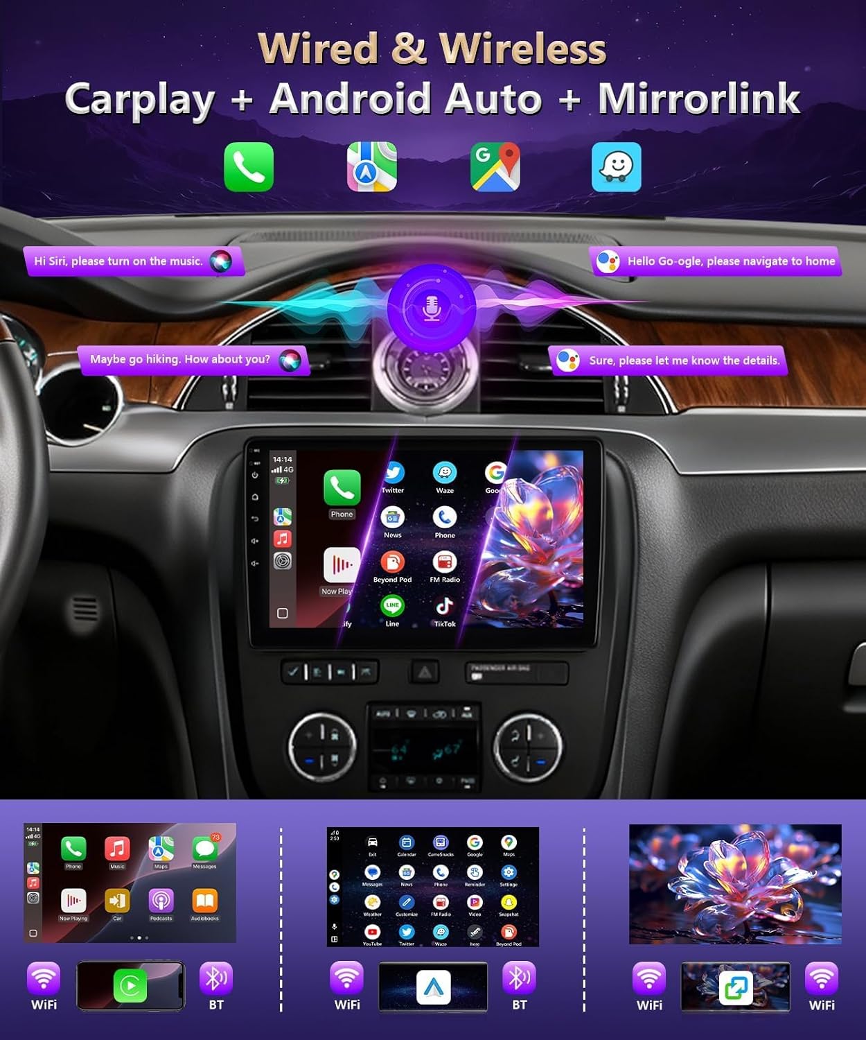 | Additional Features | 2.5D IPS Full Touchscreen, Split-Screen, Multiple UI Themes, AHD Rear View Camera Input, Lane Assist, Waterproof, Steering Wheel Control, Hands-Free Calling, Voice Control, Audio Input / Output, FM / RSD / DSP Radio, EQ Adjustment, Built-in Bluetooth & Wi-Fi, GPS Navigation, Wireless / Wired Apple CarPlay, Android Auto, Mirrorlink |
