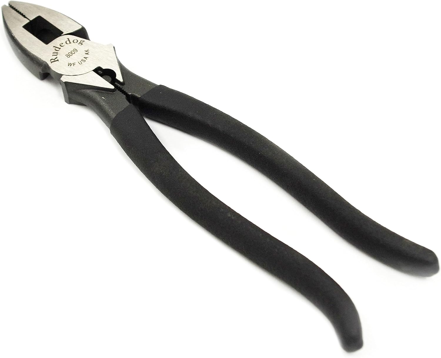 Rudedog USA - 9" Lineman Pliers, Side Cutters #8009 -These side cutting pliers have an aggressive knurl, dipped handles and a hook-bend in the handle for easier twisting and pulling. The cutting knives have been hardended and go all the way to the hinge point for extended life. We have also added a tether hole for safety, just add a keyring. These side cutting pliers are great for Linemen, Electricians, Rod Busters and Ironworkers. Made in the USA!