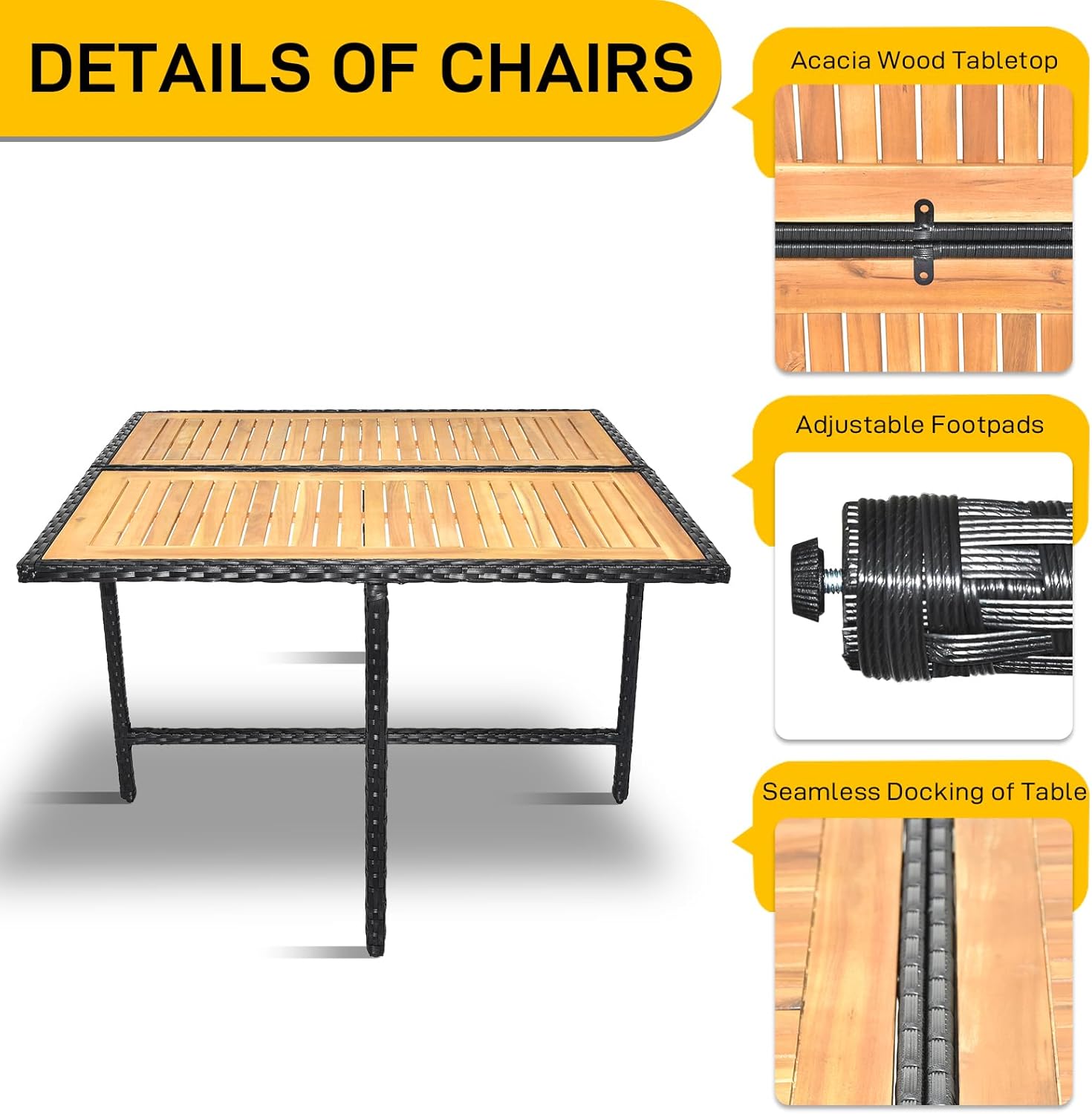 Introductions:Create memorable outdoor dining moments with our 9 Piece Acacia Wood Patio Dining Set, the ideal addition to elevate your garden, yard, or poolside area. This comprehensive set includes four armchairs, four ottomans, and a spacious dining table, providing ample seating for up to eight guests. Designed with durability and comfort in mind, this set features soft cushioned seating and a sturdy construction of PE wicker and acacia wood, ideal for any outdoor setting from gardens to poolside areas.Specifications:1. Material: PE Rattan, Steel, Acacia Wood, Polyester Fabric, Sponge2. Color: Black Rattan, Off-White Cushions3. Chair Dimensions: - Overall: (20.5 x 20.5 x 33.9)" / (52 x 52 x 86) cm (L x W x H) - Seat Size: (17.9 x 16.1 x 16.7)" / (45.5 x 41 x 42.5) cm (L x W x H) - Armrest Height: 26.6" / 67.5 cm - Seat Cushion: (17.9 x 16.1 x 2)" / (45.5 x 41 x 5) cm (L x W x H) - Back Cushion: (18.1 x 16.5 x 2)" / (45 x 42 x 5) cm (L x W x H)4. Ottoman Dimensions: - Overall: (15.9 x 15.9 x 13.6)" / (40.5 x 40.5 x 34.5) cm (L x W x H) - Seat Cushion: (15.9 x 15.9 x 2)" / (40.5 x 40.5 x 5) cm (L x W x H)5. Table Dimensions: - Overall: (43.3 x 43.3 x 29.1)" / (110 x 110 x 74) cm (L x W x H) - Tabletop: (40.9 x 19.7 x 1.2)" / (104 x 50 x 2) cm (L x W x H)6. Weight Capacity: - Chairs: 400 lbs / 180 kg - Ottoman: 400 lbs / 180 kg - Table: 222 lbs / 100 kg7. Net Weight: 56.2 lbs / 25.5 kgPackage Includes:1 x 9 Piece Dining Set1 x Set of Assembly Hardware1 x Assembly Manual