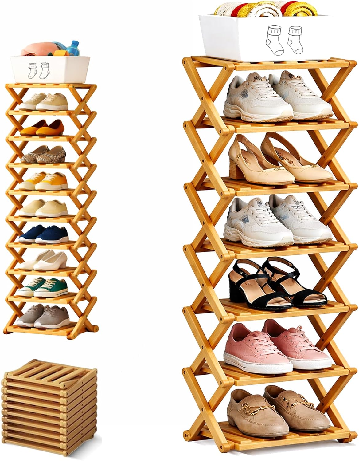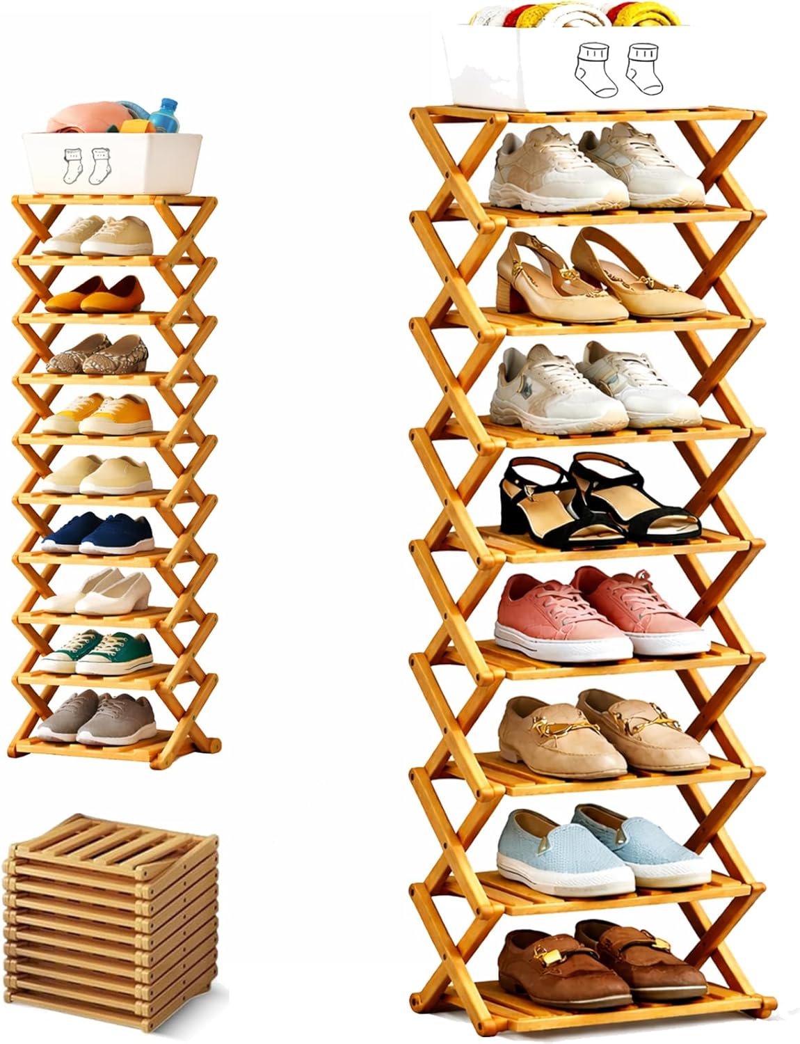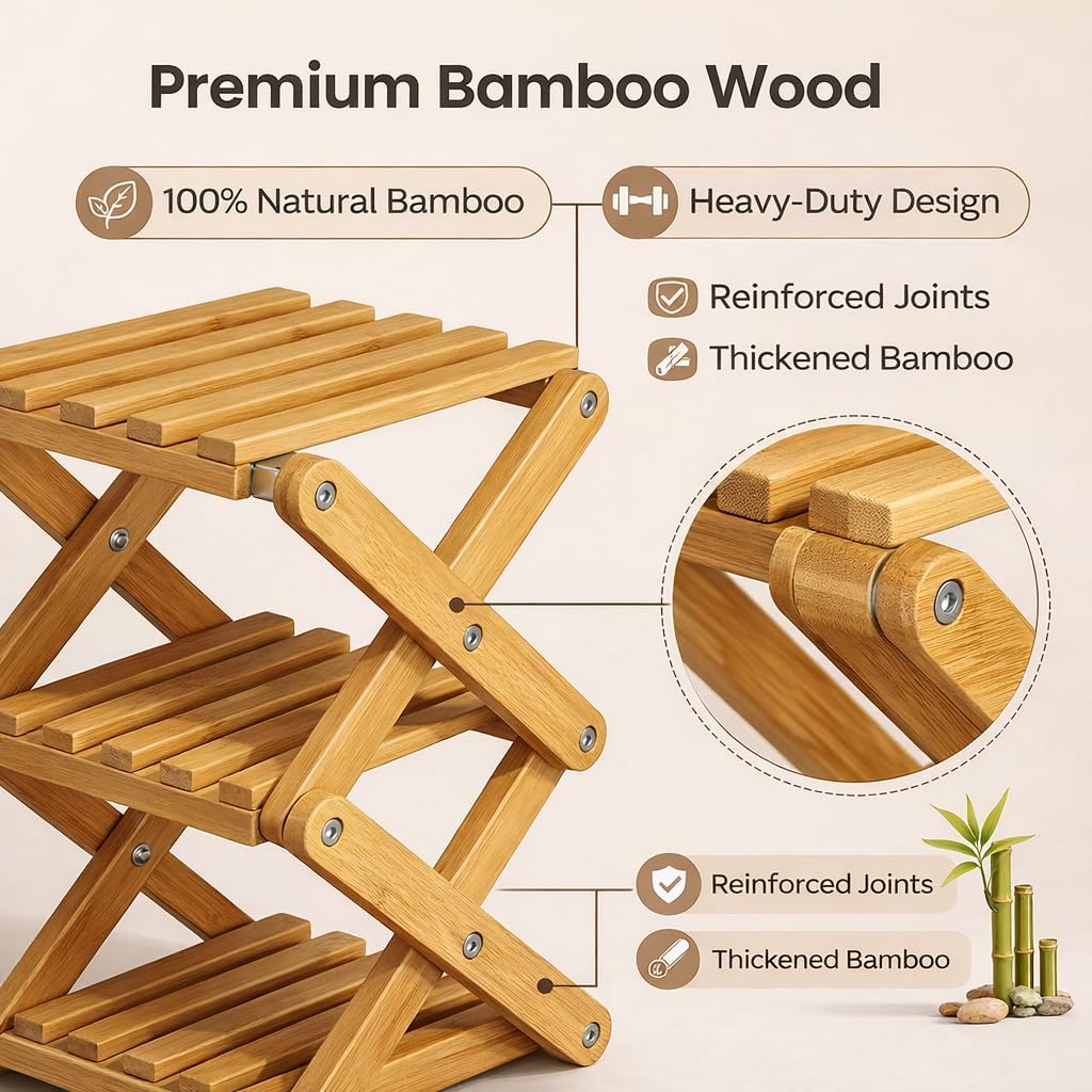 Specifications: Product Name: Folding Multi-Tier Organizer Rack Material: Nan Bamboo Dimensions: Width 10.2 in / 26 cm (varies by tier/height option) Functions: Vertical tiered storage; fold-and-lock setup; folds flat for storage Care: Wipe clean with a damp cloth Tiers: 2/3/4/5/6/7/8/9 fixed shelves Weight Capacity: 33 lbs per tier / 15 kg per tier Assembly Required: None – unfolds instantly Color: Natural wood color, Brown Package Includes: 1 Pcs * Bamboo Shoe Storage Rack Note: 1. Please allow slight dimensional error due to manual measurement. Thank you for your understanding 2. Due to different monitors and different lighting, the picture may not show the actual color of the item. Thank you for your understanding!