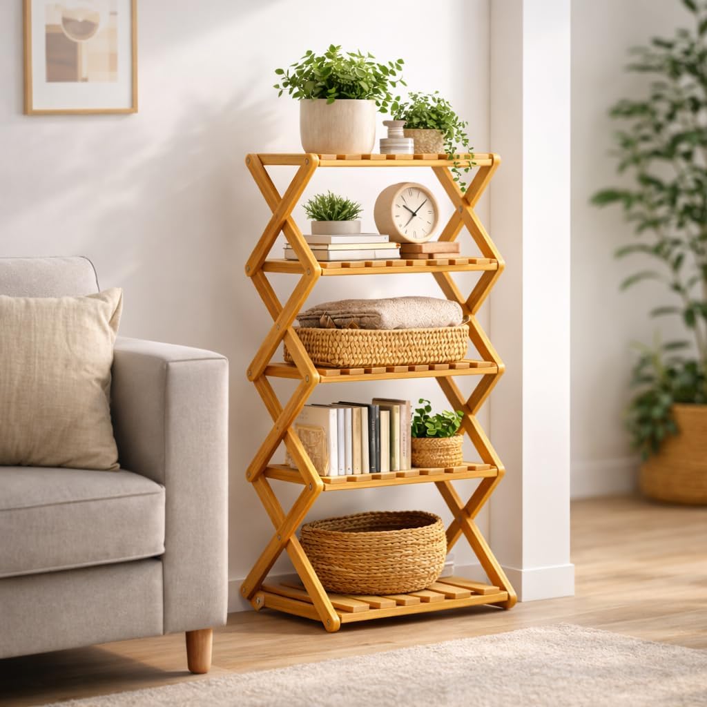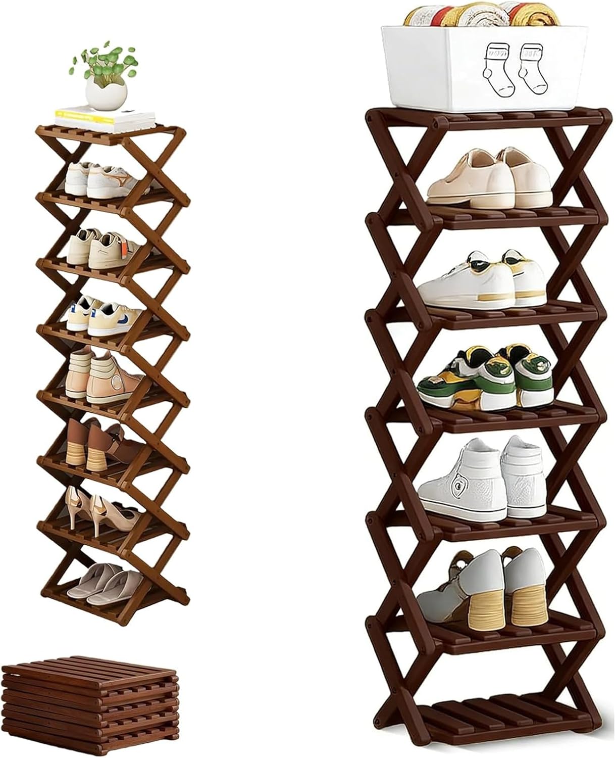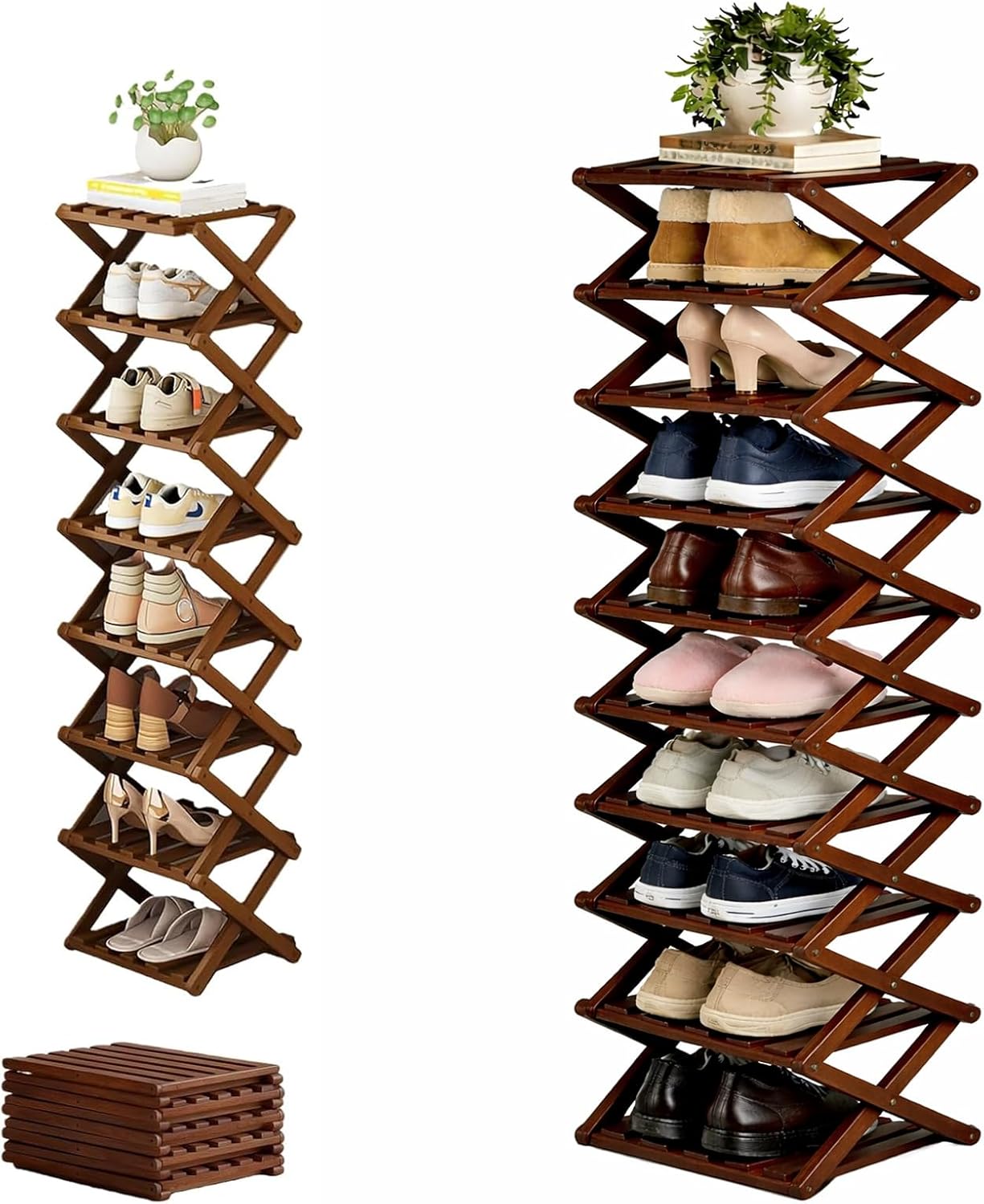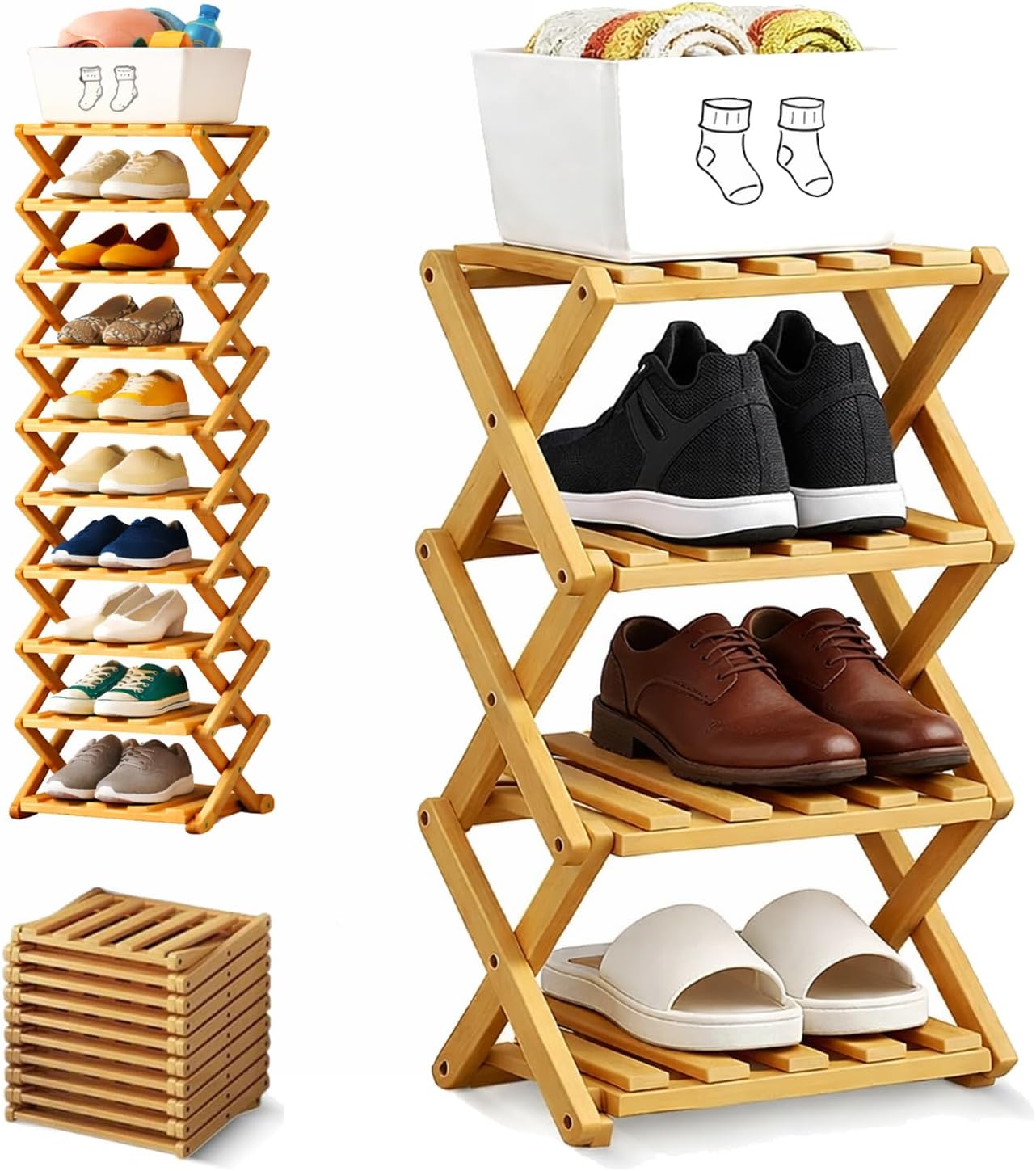 Specifications: Product Name: Folding Multi-Tier Organizer Rack Material: Nan Bamboo Dimensions: Width 10.2 in / 26 cm (varies by tier/height option) Functions: Vertical tiered storage; fold-and-lock setup; folds flat for storage Care: Wipe clean with a damp cloth Tiers: 2/3/4/5/6/7/8/9 fixed shelves Weight Capacity: 33 lbs per tier / 15 kg per tier Assembly Required: None – unfolds instantly Color: Natural wood color, Brown Package Includes: 1 Pcs * Bamboo Shoe Storage Rack Note: 1. Please allow slight dimensional error due to manual measurement. Thank you for your understanding 2. Due to different monitors and different lighting, the picture may not show the actual color of the item. Thank you for your understanding!