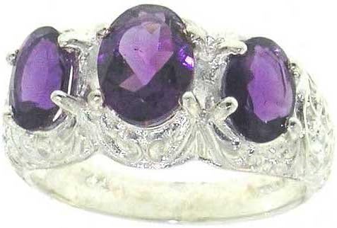 A classic 3 stone Sterling Silver ring set with a centre 8x6mm (0.32"x0.24") & two 7x5mm (0.28"x0.20") vibrant Amethysts. A fabulous scroll carving is found on the shoulders of the ring. Let her face light up with this beautiful ring.