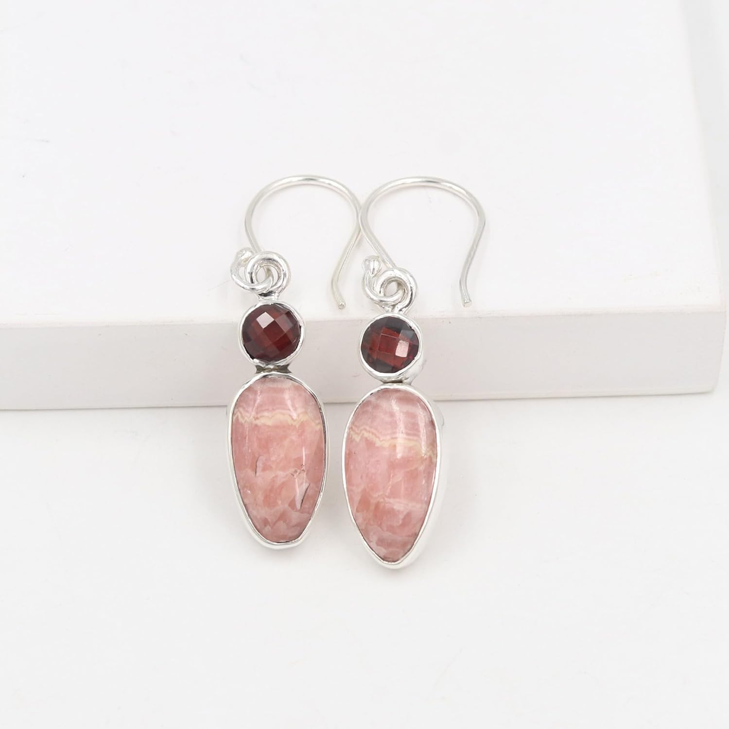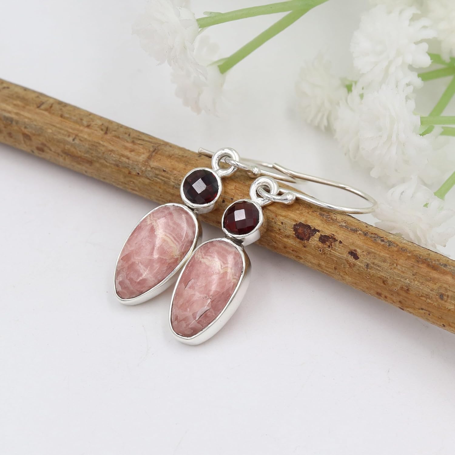 925 Sterling Silver Rhodochrosite & Garnet Drop Earrings – Statement Pink & Red Dangle Earrings for Women