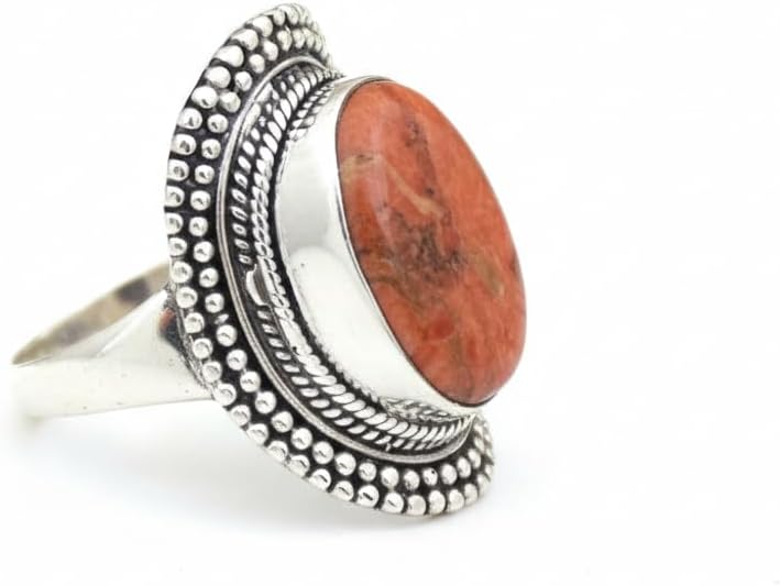 Make a bold statement with this exquisite handcrafted sterling silver ring featuring a stunning natural sponge coral centerpiece. The vibrant orange-red coral stone is beautifully framed by intricate oxidized silver work, showcasing traditional tribal artistry. The ring's elaborate setting includes double rows of delicate silver beading and twisted rope details that create a mesmerizing vintage appeal. This statement piece combines the raw beauty of natural coral with sophisticated metalwork, making it perfect for both casual and formal occasions. The substantial sterling silver band ensures durability while maintaining comfort for everyday wear. Each ring exhibits unique variations in the natural coral stone's patterns and textures, making your piece truly one-of-a-kind. This eye-catching accessory adds a touch of bohemian elegance to any outfit and serves as a remarkable conversation starter. The timeless design draws inspiration from classic tribal jewelry while maintaining a contemporary sophistication that transcends trends.