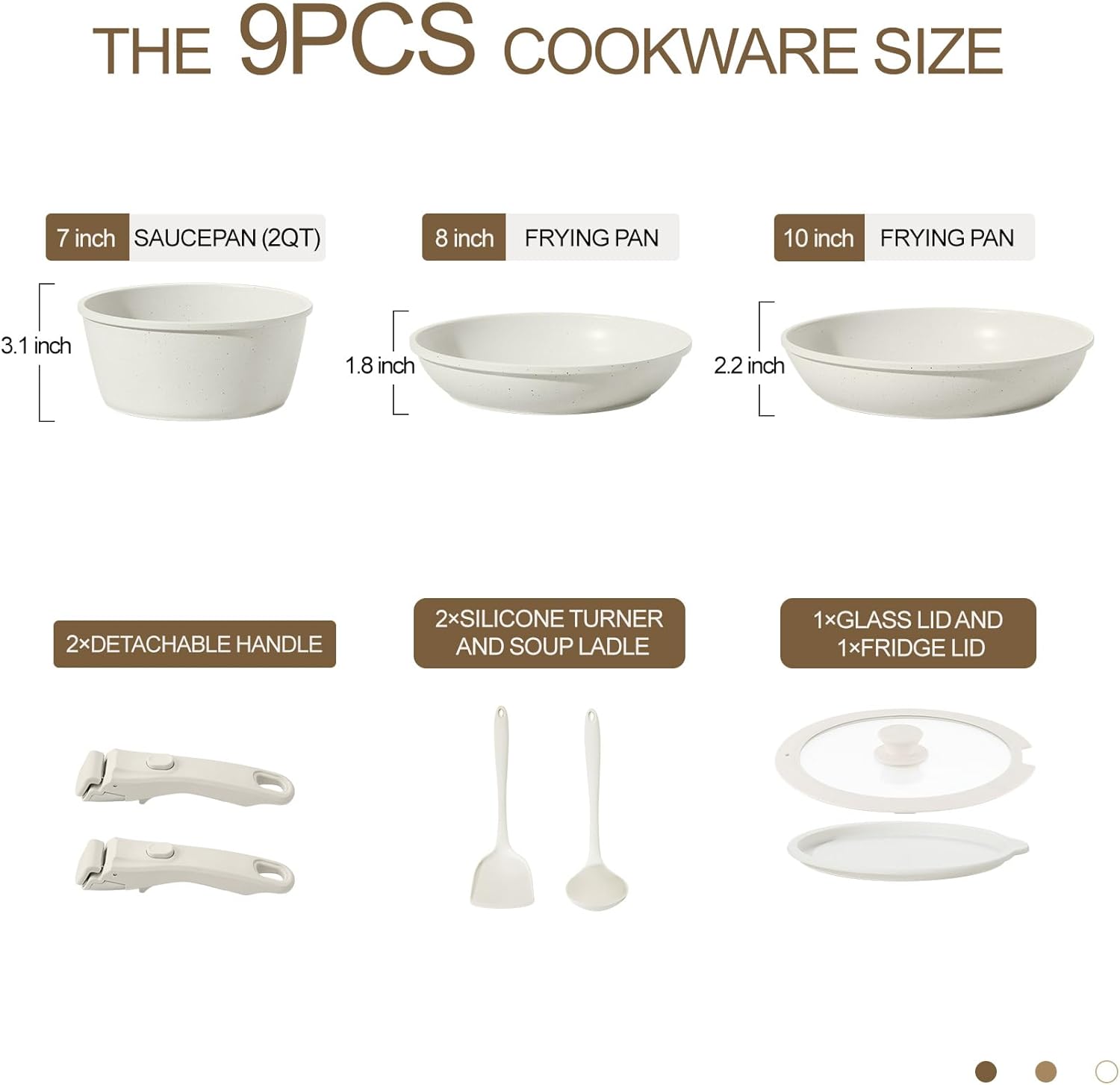 | Included Components | 1 x 8 Inch Frying Pan, 1 x 10 Inch Frying Pan, 1 x 7” 2QT SaucePan, 1 x 7” glass lid, 1 x 7” Fridge Lid, 2 x Detachable Handle, 1 x Silicone Turner, 1 x Soup Ladle |