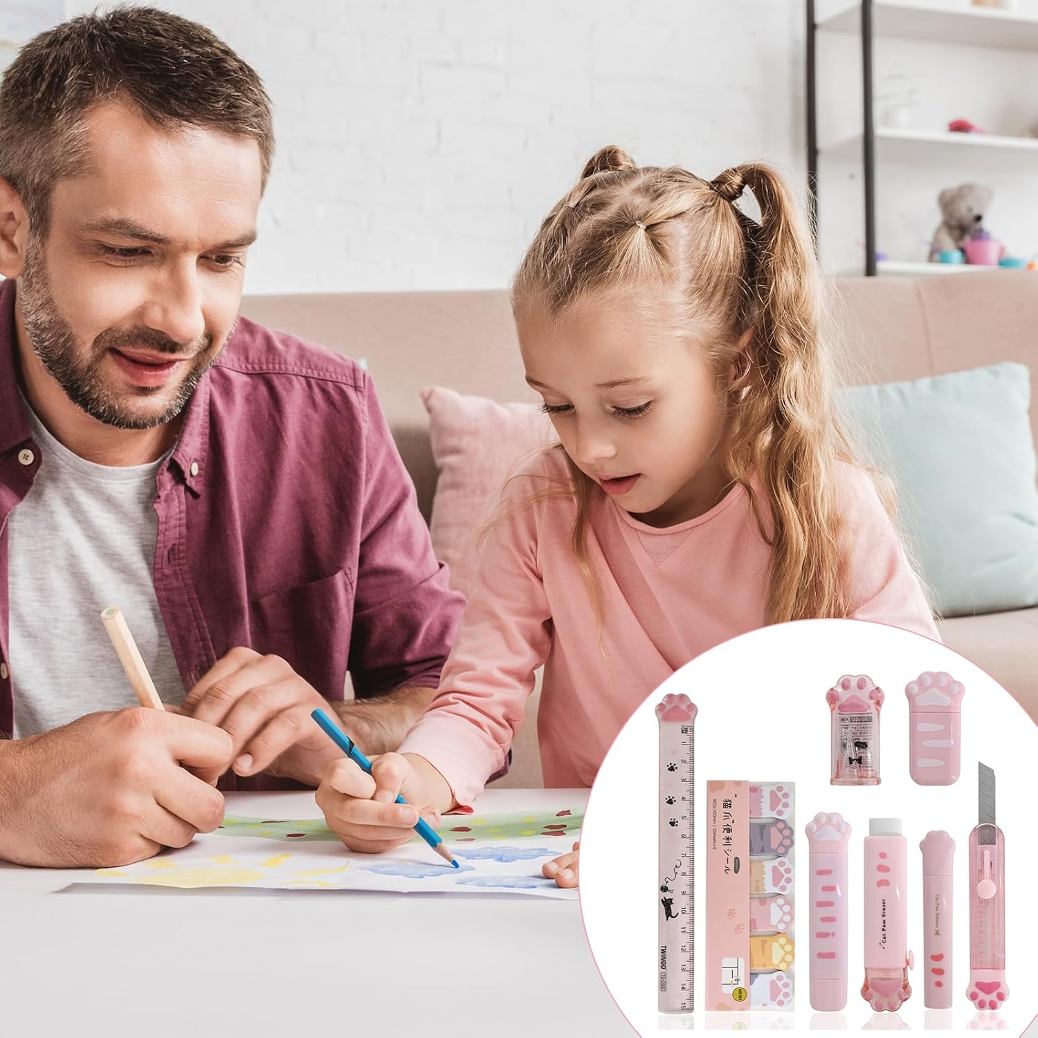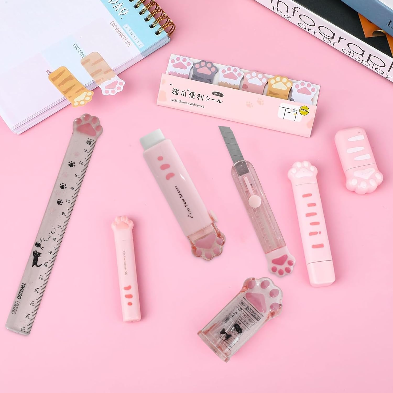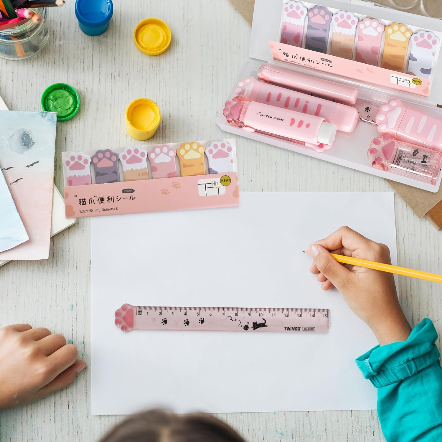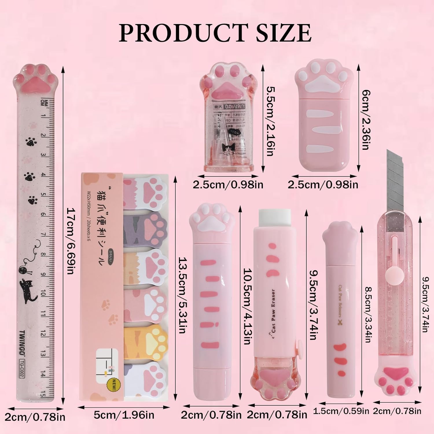 Features: Material: Plastic, Metal, Paper Colour: Pink Weight: 150 g Size: 18.5*6.5cm Package: 1 x correction tape. 1 x ruler. 1 x eraser. 1 x Art Knife 1 x pencil sharpener. 1 x portable scissors. 1 x sticky cat claw note. 1 x 2 in 1 Cat Claw Correction Tape 1 x pencil case. ✓ The cat claws stationery box can accommodate multiple pens, pencils and other stationery, helping you organize and manage the messy items on your desk, and has good storage functions, very suitable for boys and girls. ✓Cute cat paw design, cute and cute, small and portable, very practical, environmentally friendly and healthy, cat theme stationery set to meet children's learning needs. ✓ If you have any questions, please feel free to contact us. We will try our best to solve the problem for you and look forward to your visit!