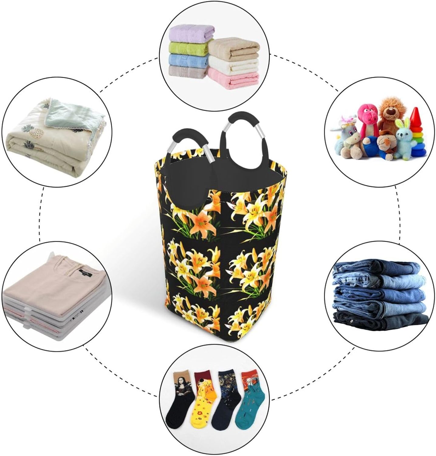 Our A bouquet of yellow lilies dirty clothes storage bag is made of polyester, which is lightweight and flexible. It can maintain a stable shape even under heavy pressure and collision. At the same time, the incorporation of Oxford cloth material significantly improves the durability of the product, and it is resistant to wear, bumps and pulling. The storage bag is designed with a large capacity, which can easily carry winter clothes, daily clothes and a variety of sundries. It is easy to carry and store, and fits tightly into the gap of the suitcase after folding. The aluminum handle is sturdy and reliable, supports hanging, and is suitable for a variety of places. In terms of design, it adopts leak-proof technology, combined with waterproof coating and precision sewing, which is effectively waterproof. The exterior uses cutting-edge transfer technology, and a PE board support is added at the bottom to ensure stable load-bearing and prevent tipping. This storage bag is practical and easy to use, and is an ideal choice for travel and home.