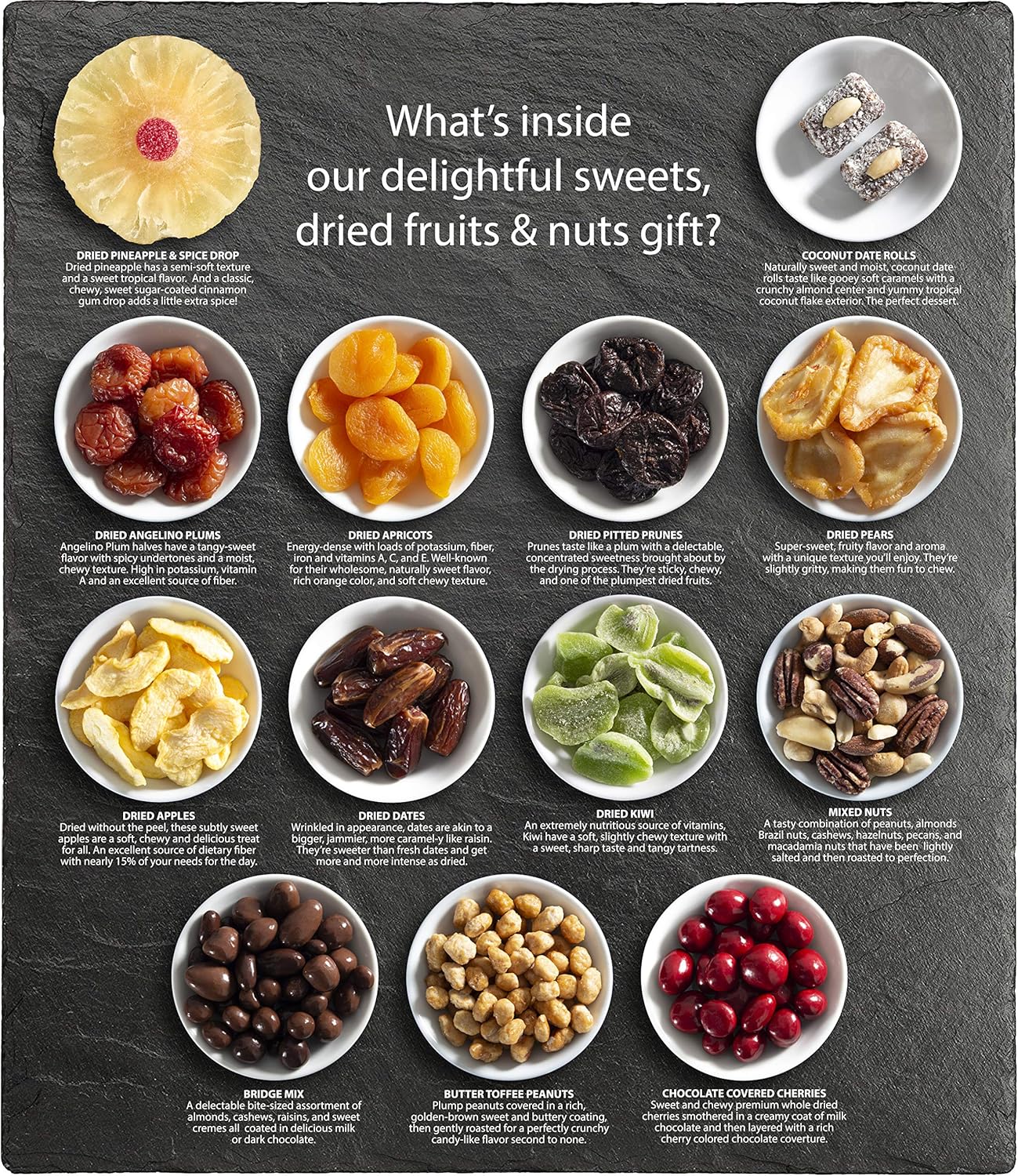 A festive assortment of fresh dried fruit, mixed nuts, chocolate covered cherries, chocolate bridge mix, and butter toffee peanuts in a wooden crate tied with a ribbon.