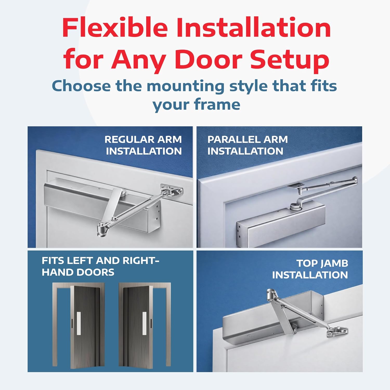 | Included Components | Adjustment Screws, Door Closer Body, Installation Hardware, Installation Manual, Mounting Bracket |