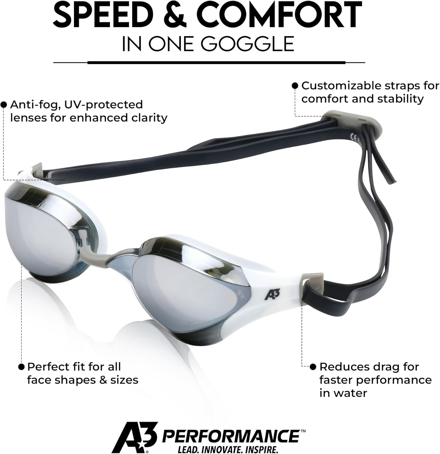 Introducing the MATRIX Swim Goggles by A3 Performance, where elite racing technology meets all-day training comfort. These UV swim goggles are built to help you perform at your highest level, without compromise. MATRIX Goggles offer a new level of Speed and Comfort. You may have had to put up with discomfort and sometimes painful styles to wear an elite racing goggle. No More! This low-profile design is ideal for racing, and the great visibility and comfort make it perfect for training The MATRIX changes everything. With a sleek, low-profile design, you'll glide through the water with minimal drag and maximum confidence. Designed for both competition and training, adults and juniors, gives speed and comfort in one high-performance package. What truly sets the MATRIX apart is the curved lens technology, giving you enhanced peripheral vision to stay aware of your surroundings in the water. From powerful dives off the blocks to long-haul endurance sets, the visibility is sharp, the comfort is unmatched, and the fit is elite. Engineered with precision, MATRIX goggles feature soft yet secure gaskets, interchangeable nosepieces, and a fully adjustable strap, so you get a custom fit every time. You’ll feel the quality from the moment you put them on. Treated with anti-fog coating, these anti-fog goggles maintain clarity from start to finish, lap after lap. And with built-in UV protection, your eyes stay shielded whether you're indoors or out in the sun. Whether you're chasing gold or pushing your limits in training, A3 Performance’s MATRIX swim goggles are your next-level advantage.