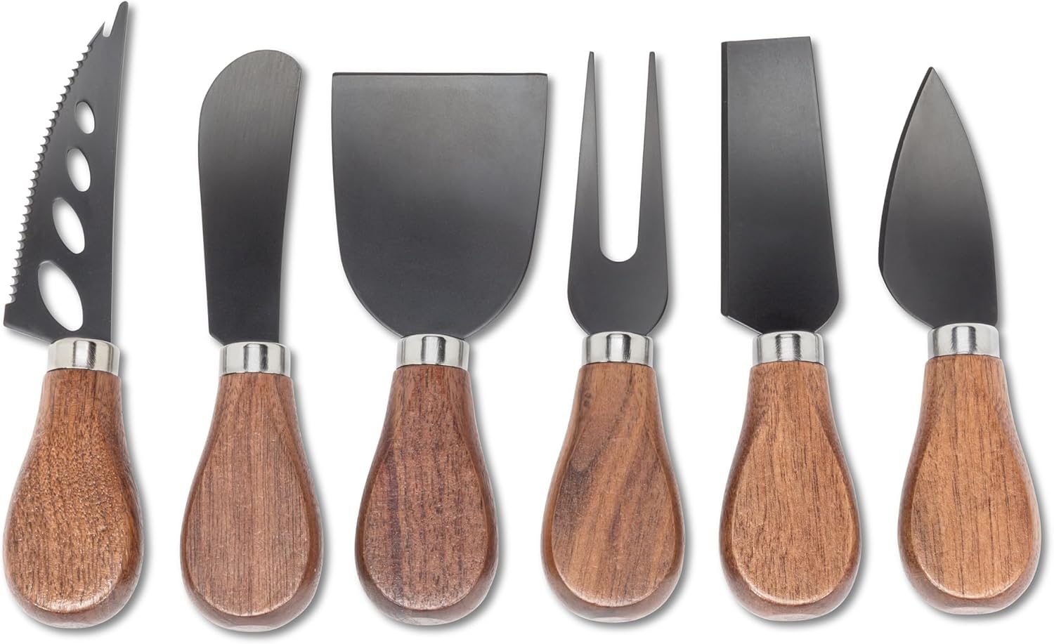 Our Set of 6 Walnut Handled Cheese Knives come beautifully boxed to elevate the gift giving experience. Stainless steel blades are coated with a sleek black Teflon finish. Perfect for charcuterie and cheese boards.
