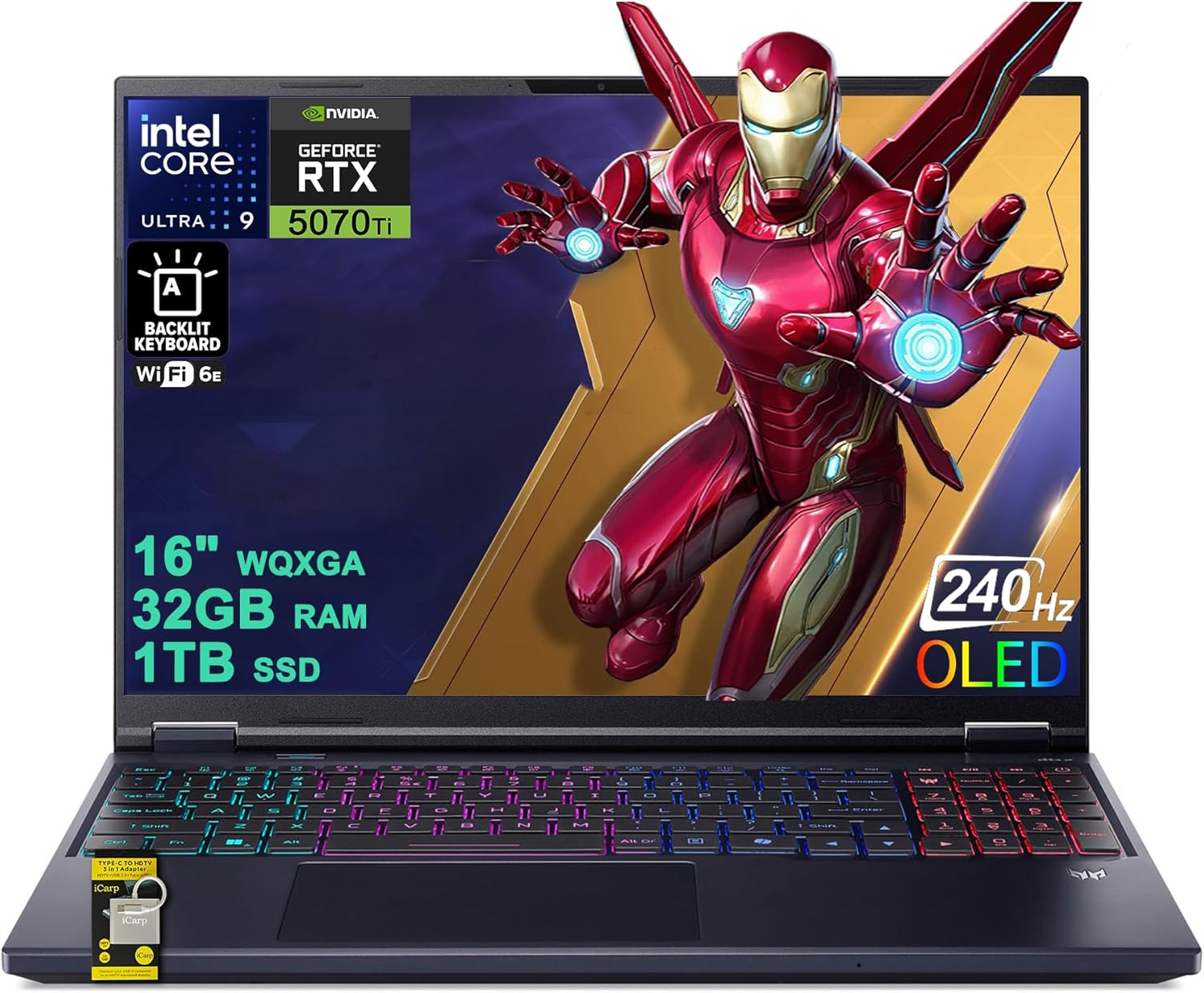 Product Details: Microprocessor: Intel 24-core Ultra 9 275HX Processor (Base Clock 2.7GHz, Max Boost Clock Up to 5.4GHz, 40MB Smart Cache, 24 Threads) Memory:32GB RAM Storage:1TB SSD Operating system: Microsoft Windows 11 Home Graphics & Video: Dedicated NVIDIA GeForce RTX 5070 Ti 12GB Graphic 16" WQXGA (2560 x 1600) OLED 240Hz (100% DCI-P3, G-SYNC) Key Features: RGB Backlit Keyboard: Yes Wi-Fi 6E: Yes DTS:X: Yes Ports: 3 x USB-A 3.2, 2 x USB-C 3.2, 1 x HDMI 2.1, 1 x RJ45 Gigabit Ethernet, 1 x MicroSD Card Reader Battery:76Wh Additional Information: Dimension: 10.85" x 14.05" x 0.79" Weight: 5.07 lbs.