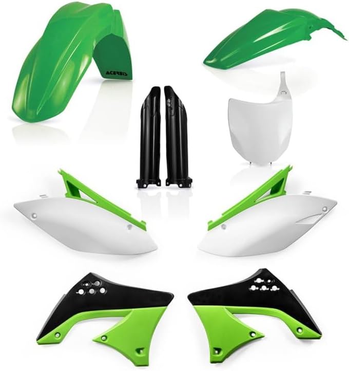 All plastics included in the Acerbis plastic kit have the original factory shape of the selected bike model. Kits include front and rear fender, lower fork covers, radiator shrouds, side panels (except where noted) and airbox covers (where applicable). So